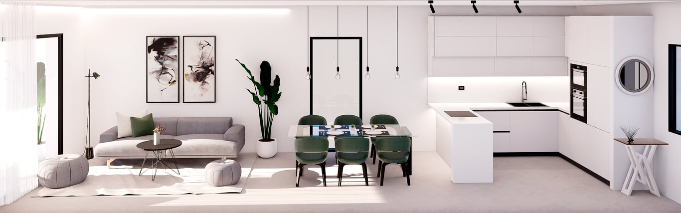 Apartments with 2 bedrooms and 2 bathrooms with a spacious living area, guaranteed panoramic views of the city of Benidorm and the Mediterranean Sea, and natural light throughout the house thanks to its large side windows.The residential complex has 3 swimming pool and jacuzzi areas, a wellness area with gym and paddle tennis court, large green areas, a children's play area and elevator in all buildings.