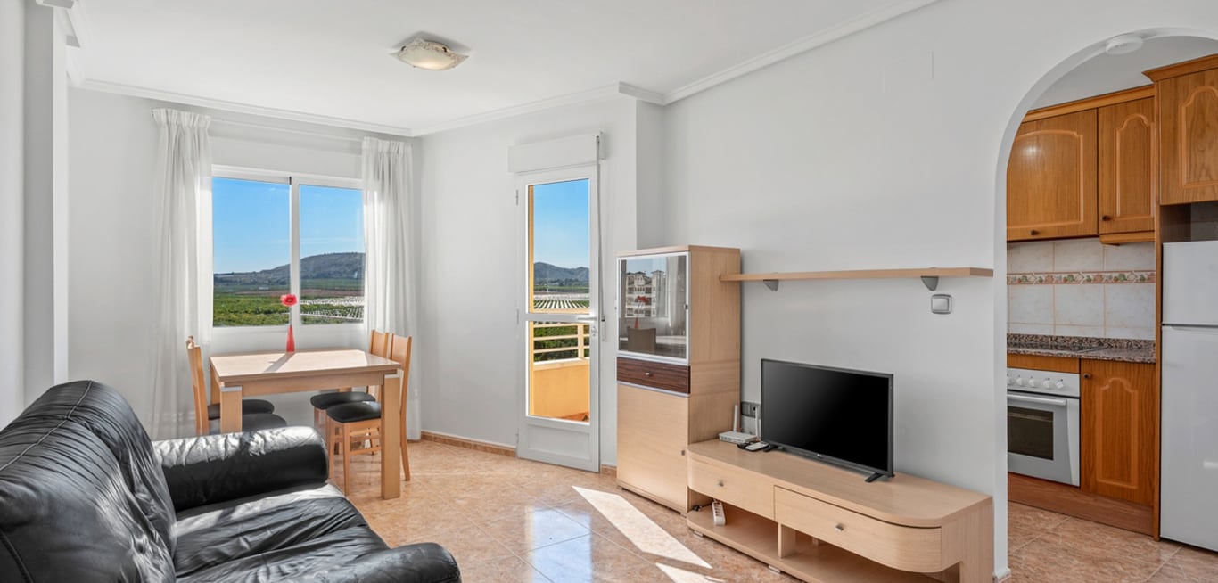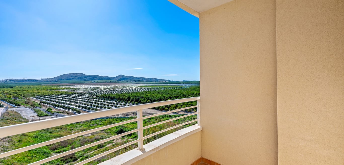 This charming two-bedroom apartment with stunning countryside views is located in the centre of Algorfa, Alicante. The property features a bright living/dining room, a fully equipped semi-open kitchen, two bedrooms with fitted wardrobes, a bathroom with a bathtub, a south-facing terrace with fantastic views of the surrounding countryside and mountains, and there is also a private rooftop terrace/solarium for making the most of the sun and the views.