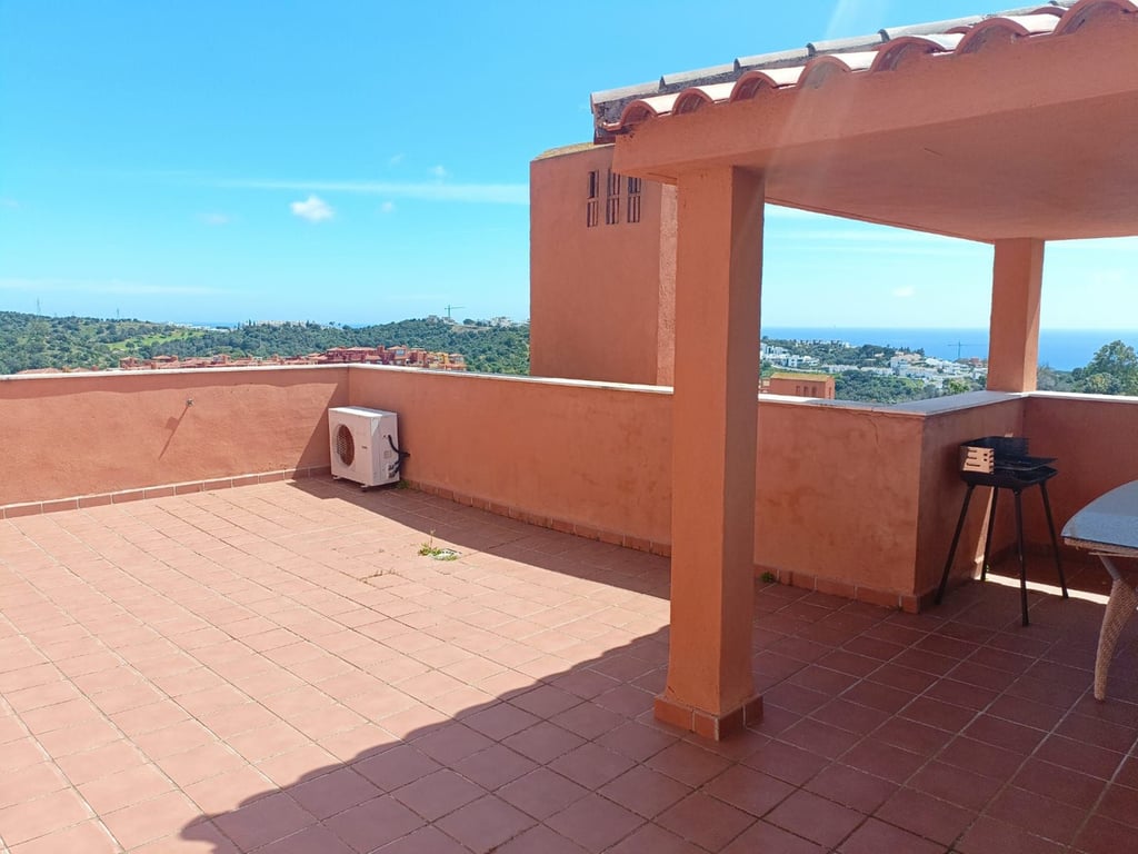 Duplex penthouse for sale, corner unit with panoramic sea and mountain views! 2 bedroom, 2 bathroom apartment, 1 en-suite, features 2 spacious terraces – both with open views, living-dining room and equipped kitchen, A/C, built-in wardrobes. Underground parking space and storage room are included in the price. The community offers 5 swimming pools, mature gardens, concierge and security service, a small restaurant to enjoy. It is a short walk to the best beaches of Marbella, 15 minutes to Marbel...
