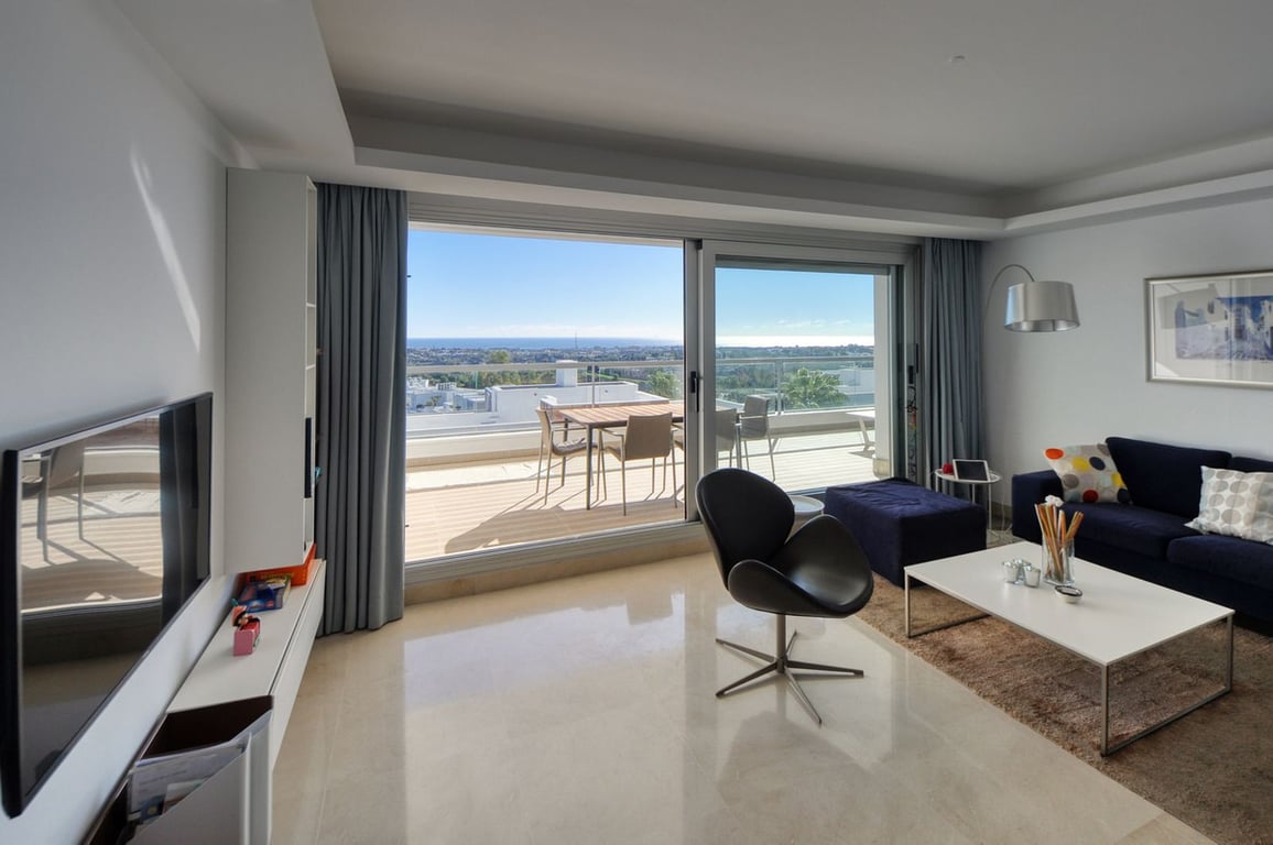 Elevated 2-bedroom, 2-bathroom apartment in Avalon, Los Arqueros, offering panoramic sea views and open views towards La Concha. Bright open-plan living/dining area with floor-to-ceiling sliding doors leading to a spacious, mostly covered terrace. Modern fully fitted kitchen with separate utility room. Master bedroom with en-suite bathroom and direct terrace access. Second bedroom with fitted wardrobes and separate bathroom. Features include marble floors, hot/cold air conditioning, double glazi...