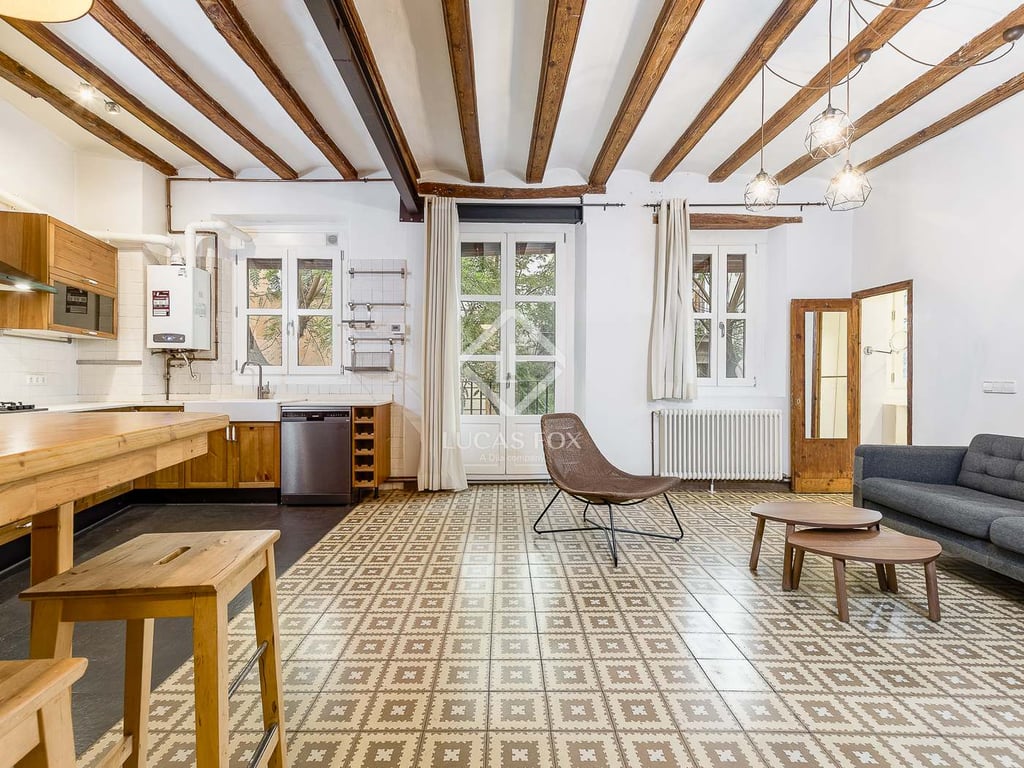Step into a piece of Barcelona’s history with this spacious 95 m2, 2-bedroom corner apartment in the heart of El Born. Brimming with character, it features original mosaic floors, elegant wooden beams, and four charming balconies that flood the home with natural light. The heart of the home is the large and cosy living and dining area with an open-plan kitchen, perfect for entertaining or relaxing in comfort. The main suite is truly exceptional, so spacious it includes three private balconie...