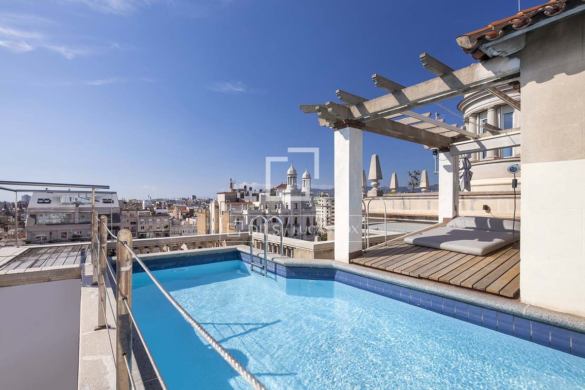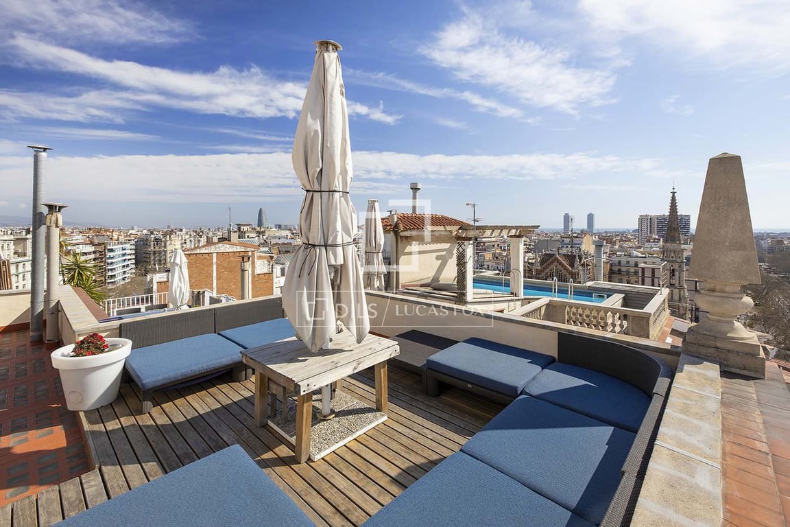 This stunning penthouse hosts 269 m2 distributed across two floors and a turret with 360º exposures. With straight access from the main lift, we walk through a hall that leads to a large central space composed by the living area and a dining room and an access to a terrace at the same level. A full equipped and red lacquered kitchen, is directly connected to the dining room and features a large window framing Gaudi’s masterpiece, Sagrada Familia. On the same floor there are three bedrooms, one ...