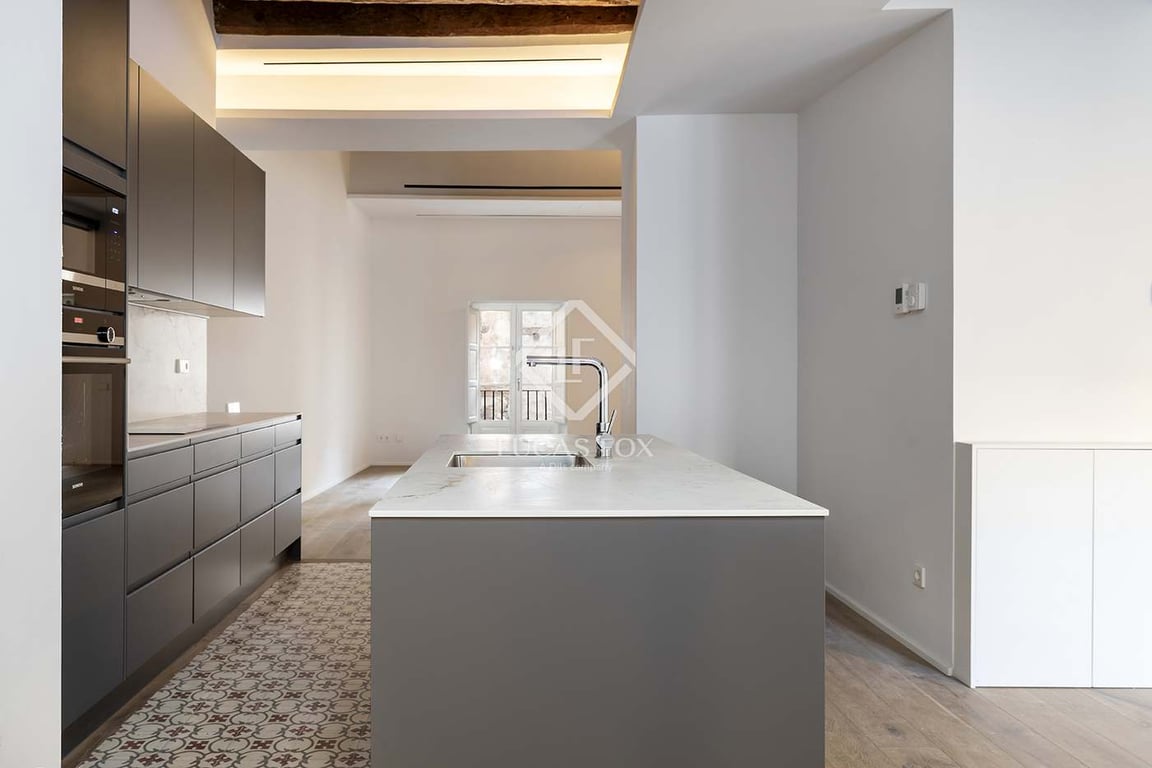 Lucas Fox presents the new build development Banys Vells, in a remodeled listed building located in the Born neighbourhood of Barcelona. The building is located in the walls of the old medieval baths, which is where it gets its name. The development has only five elegant apartments, as well as two commercial premises, so it enjoys great privacy. This 114 m2 attic apartment is very spacious and could be joined to the second floor of the floor, if desired, making it even larger. The day area is ...