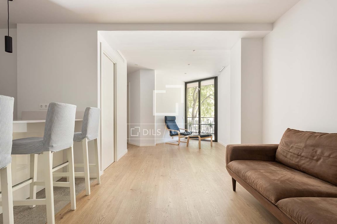 This apartment is located on the first floor of a well-kept building from 1966, with a concierge service, wheelchair access and a lift. It is in the perfect location in Sant Antoni, on a semi-pedestrian street, surrounded by nice trendy shops, bars and restaurants. As the apartment is exterior facing with very large windows, it enjoys a lot of natural light throughout. It has been renovated recently and is presented in impeccable condition. It consists of a spacious living-dining room with an ...
