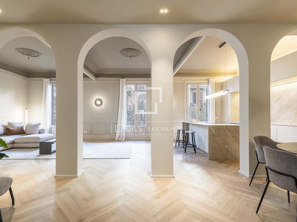 This impressive property is located in a very well-preserved period building on the prestigious Mallorca street, between Rambla Cataluña and Balmes. Its 175 m2 offer an elegant and contemporary design, combining the best of traditional architecture with modern comforts. Upon entering, a large entrance hall distributes the space into the two main areas of the house. To the left, we find a day area that houses a bright living room and a spacious dining room, both connected by an elegant arched w...
