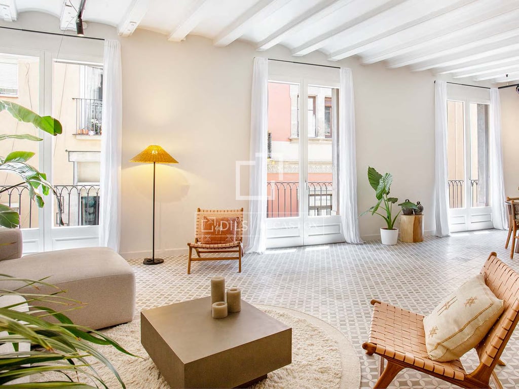 We present this magnificent renovated property with two bedrooms and two bathrooms. It is located in one of Barcelona's most desirable areas : on the border between El Born and Eixample. This apartment perfectly combines its original character with a contemporary and functional design. In addition to being located in a classic building with an approved project for the future installation of a lift, it stands out for its light thanks to a large balcony with three doors overlooking an emblematic...