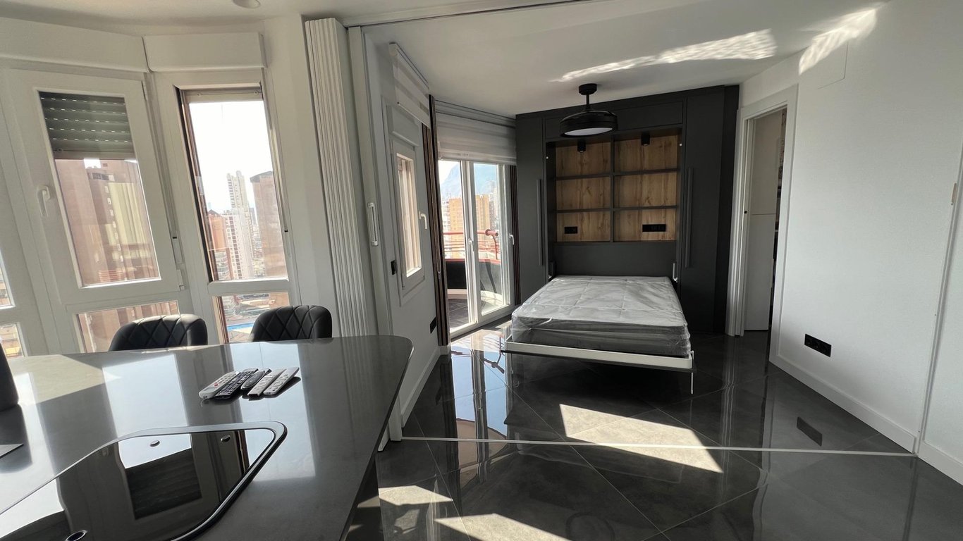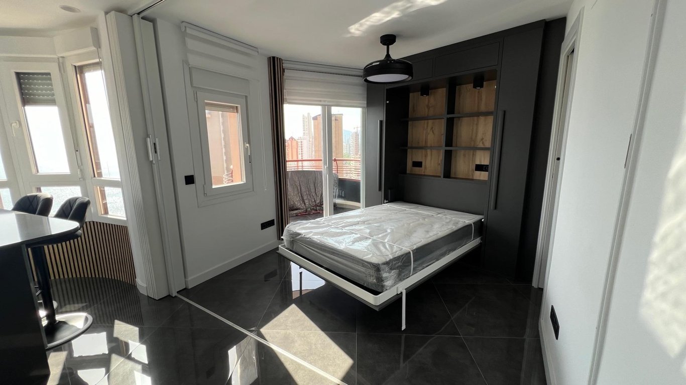 1. Apartment → Apartment in Benidorm Levante area, 45 m. surface, 50 m. from the beach, a double room, a bathroom, renovated property, equipped kitchen, white lacquered interior carpentry, south facing, porcelain stoneware floor.. Extras: pmr access, water, burglar alarm, elevator, hot and cold pump, bright, light, community pool, armored door, terrace, sunroom, buses, downtown, shopping centers, medical centers, schools, coast, hospitals, parks, supermarkets, urbanization, 24-hour security, sea...