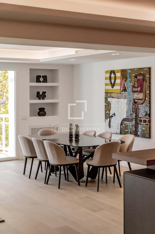 Lucas Fox presents this apartment located in the heart of Madrid, on the coveted Serrano street, located in the prestigious Salamanca district. This spacious 275 m2 apartment on the fifth floor offers abundant natural light and panoramic views of the fascinating Lázaro Galdeano museum. It has a large living-dining room, kitchen and a living room that receive abundant light through a large five-leaf floor-to- floor window. A bright corridor leads to the laundry room and a guest room. In the bed...