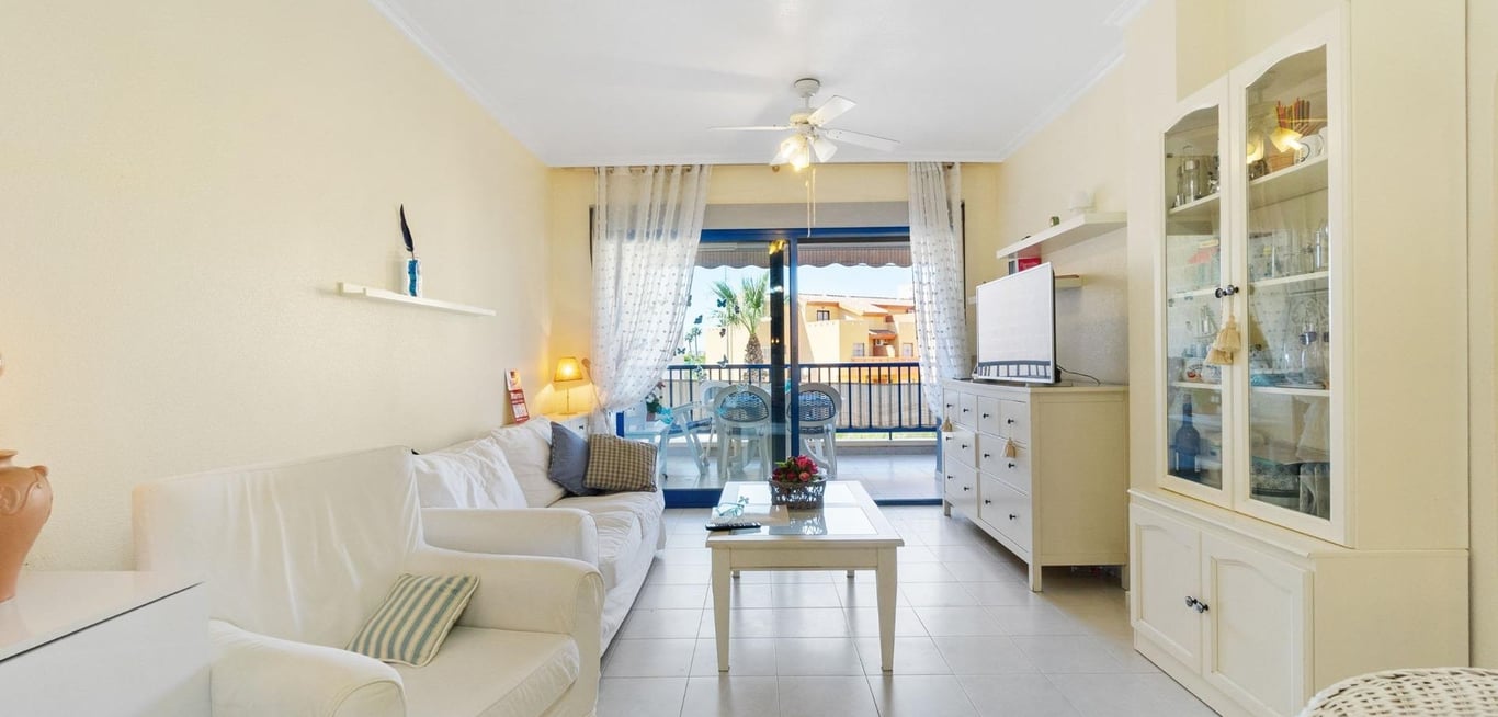 This spacious and bright apartment is located in the exclusive Aguamarina residential complex, Punta Glea, on the beachfront, with direct access to the seafront promenade. Located on the first floor, it faces southeast to enjoy the sun almost all day long. With a surface area of 78 m2, it has a very convenient layout, offering comfort and functionality.~The apartment has two large bedrooms, each with built-in wardrobes, providing plenty of storage space, and two full bathrooms.~The separate kitc...