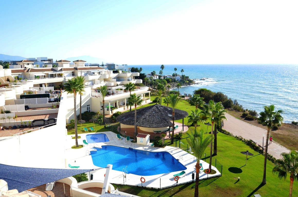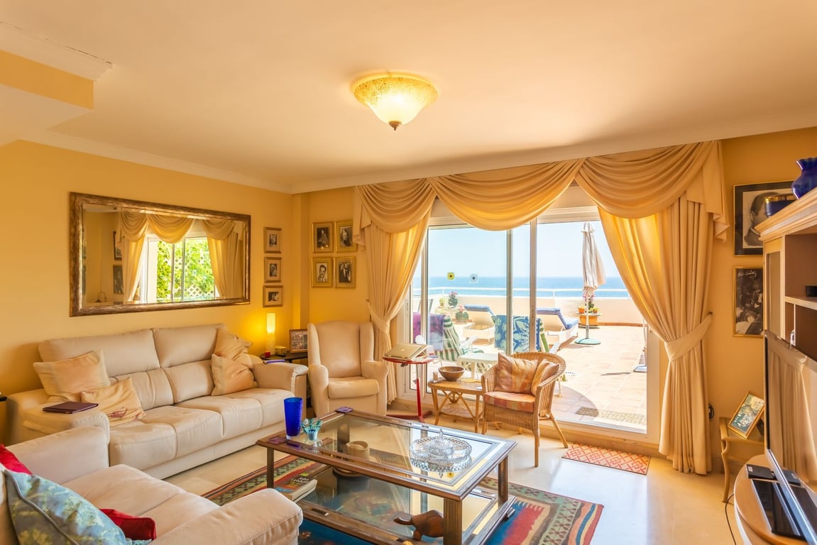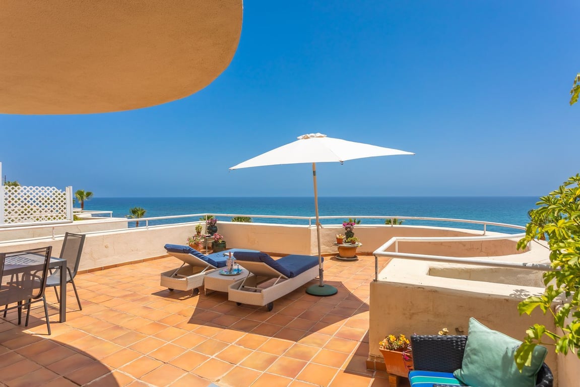 FRONT LINE BEACH APARTMENT with LARGE 77 m2 TERRACE with ALL FACING THE SEA. Good quality 2Bed/2Bathroom with LARGE LIVING ROOM and direct access to the terrace from the living room and master bedroom. Thanks to its ELEVATED POSITION, enjoy PANORAMIC VIEWS OF THE SEA, BEACH AND COAST OF AFRICA, the sunrise is a spectacle from this position. Located between ESTEPONA and the attractive Puerto Duquesa, both 5 minutes by car and where you can find all kinds of shops and leisure areas. Supermarkets,...