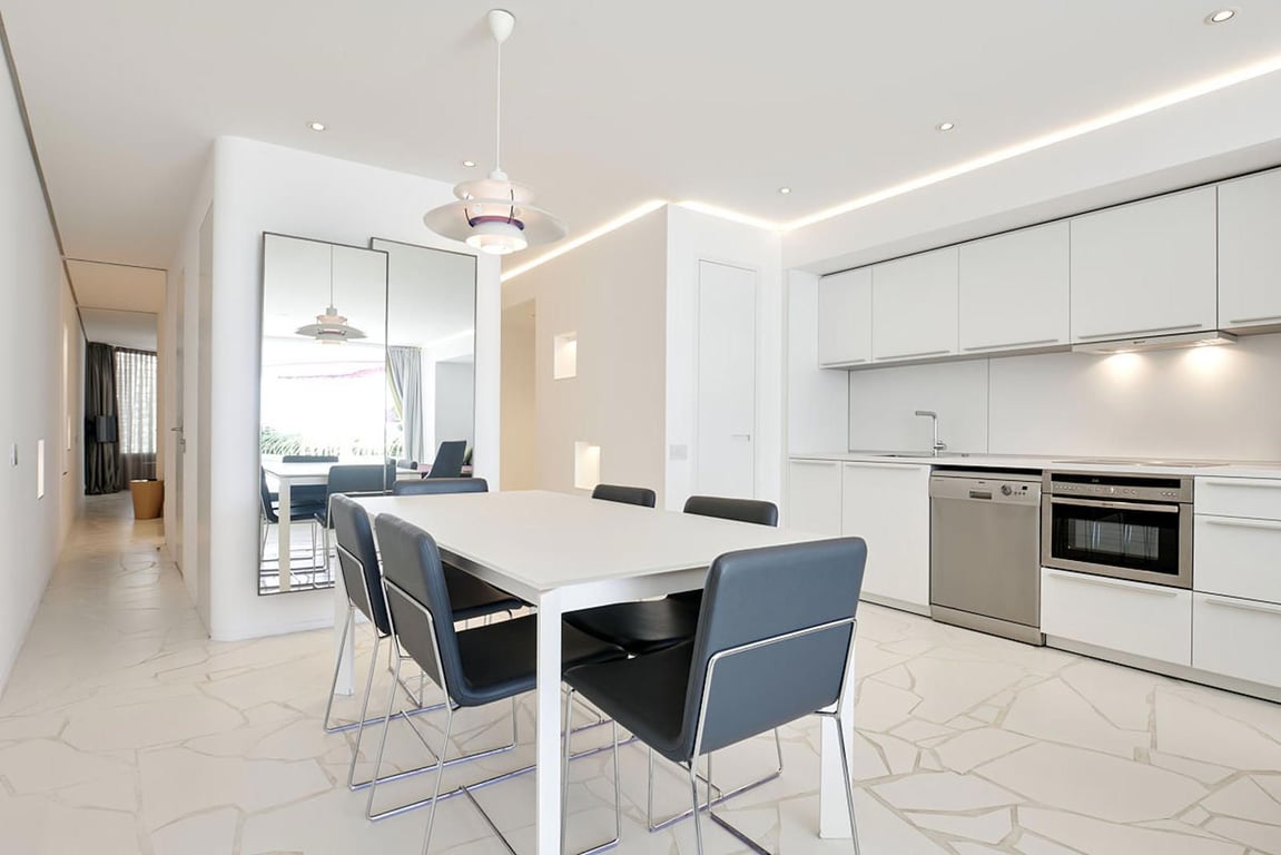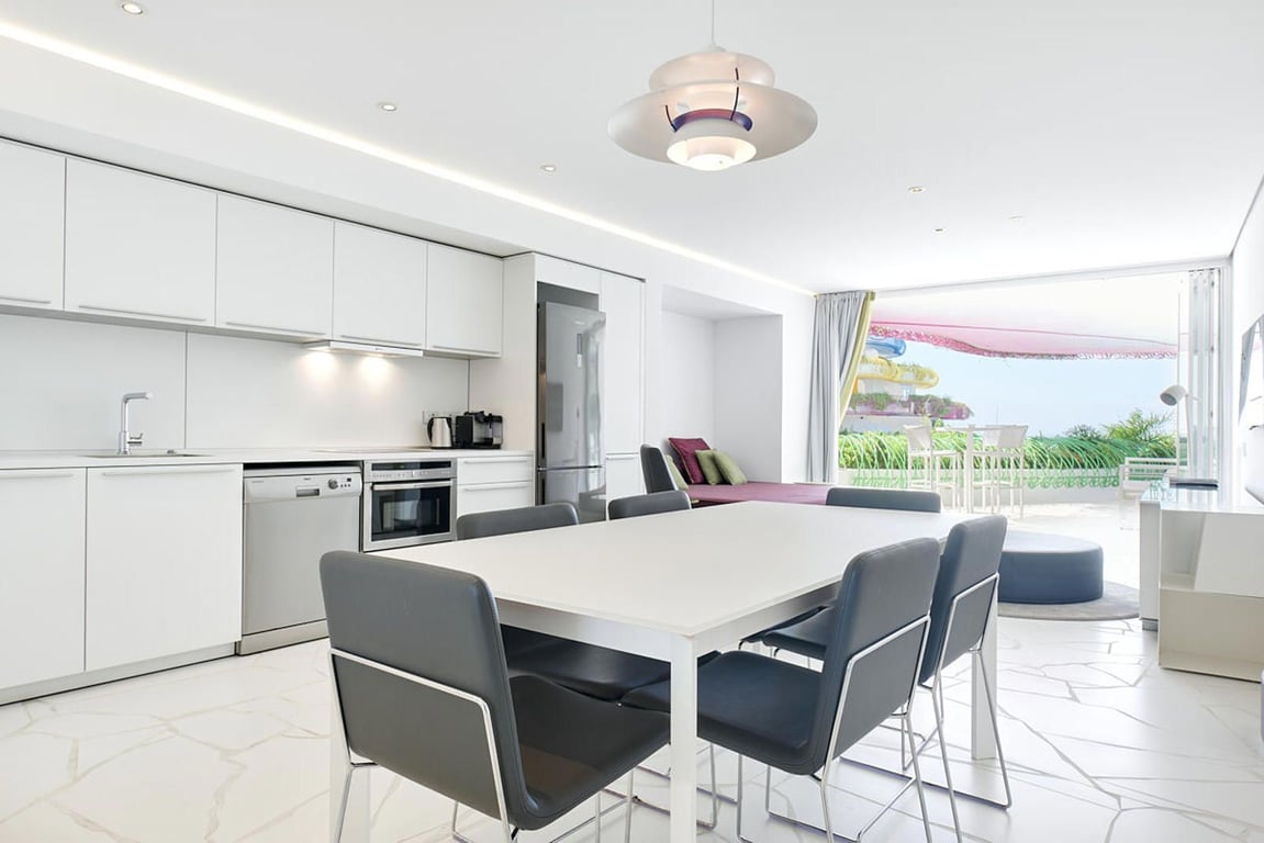 Exclusive apartment in Las Boas, built by the famous architect Jean Nouvel. This exclusive apartment is located on the Paseo Maritimo in Ibiza with stunning views of the sea and the port of La Marina, one of the most exclusive areas of the island. The apartment has a surface area of 97 m2 and is divided into two bedrooms, two bathrooms, a modern, fully equipped kitchen, a living room and a dining room. The terrace with 27 m2 offers a fantastic view. The property has a large communal pool with ...