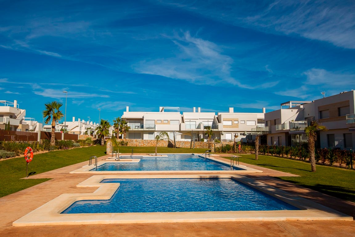 DUPLEXES LOCATED IN THE WONDERFUL AREA OF ENTRE NARANJOS. The Bella Vista duplexes are a a luxury property with the choice of ground floor with garden or the upstairs with roof solarium. You can choose between a two or three bedroom with two bathrooms. These properties have the most beautiful views of the golf course and the surrounding orange groves. This area will give you the feeling of country living although you are only a fifteen minutes drive from the Town of Torrevieja with its salt lak...