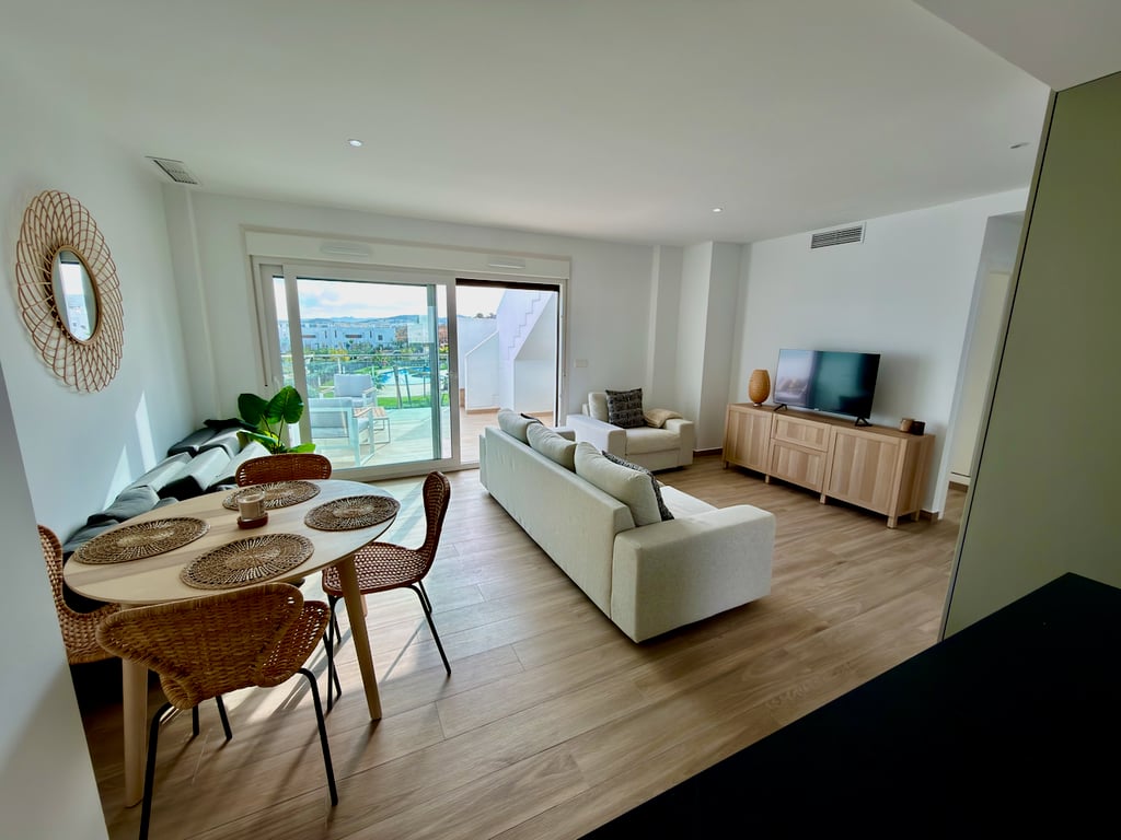 Fabulous penthouse apartment located at Vistabella Golf, built in 2022, offering modern and stylish living in a sought-after community. This spacious three-bedroom, two-bathroom property features a contemporary open-plan design with high-quality finishes and plenty of natural light.\r\nThe apartment is equipped with a fully fitted kitchen, built-in wardrobes in all bedrooms, and is furnished to a high standard with furniture negotiable. Enjoy the outdoor lifestyle with a private terrace and a la...