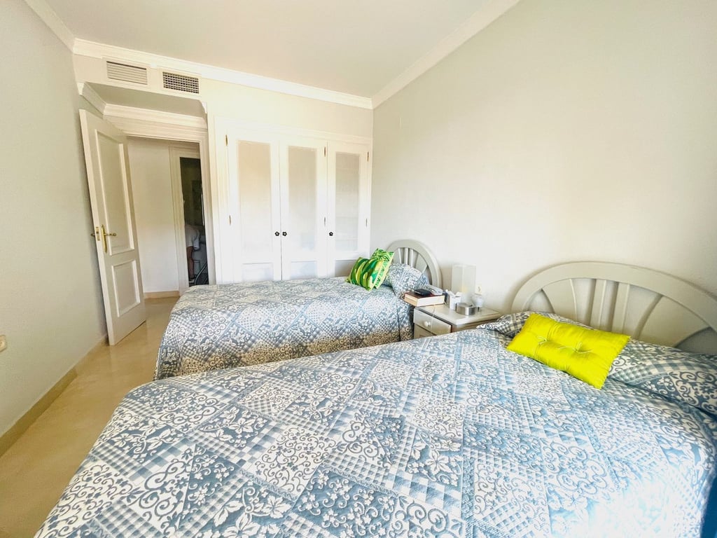 Located in a quiet gated community surrounded by greenery, this 124 m2 apartment offers both comfort and style. The spacious living and dining room opens onto a covered terrace with partial golf views, creating the perfect spot to relax. The fully fitted kitchen includes a laundry area and pantry. Both bedrooms have direct access to the terrace: the master comes with an en-suite bathroom, while the second bedroom has a separate bathroom. The urbanization also features landscaped gardens and two...