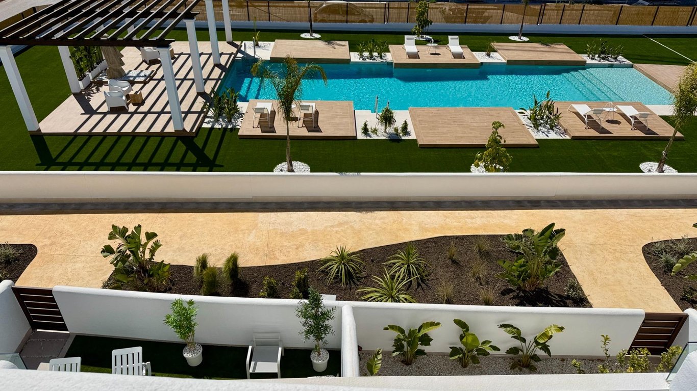 Ground floor corner apartment with terraces on 3 sides total 129 m2. ~~Some photos might be from an apartment with slightly different layout.~~The development got a large communal area with a large pool included shower and toilet facilities. Allocated covered parking (with solarpanels on top for community electricity). Pre-installation for electric car charging.~~3 bed, 2 bath. ~~This fantastic apartment is in the Serena Golf area of Los Alcazares. ~~Apartment consist of lounge with open kitche...