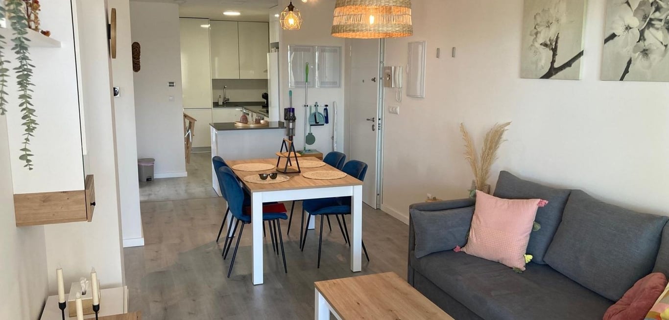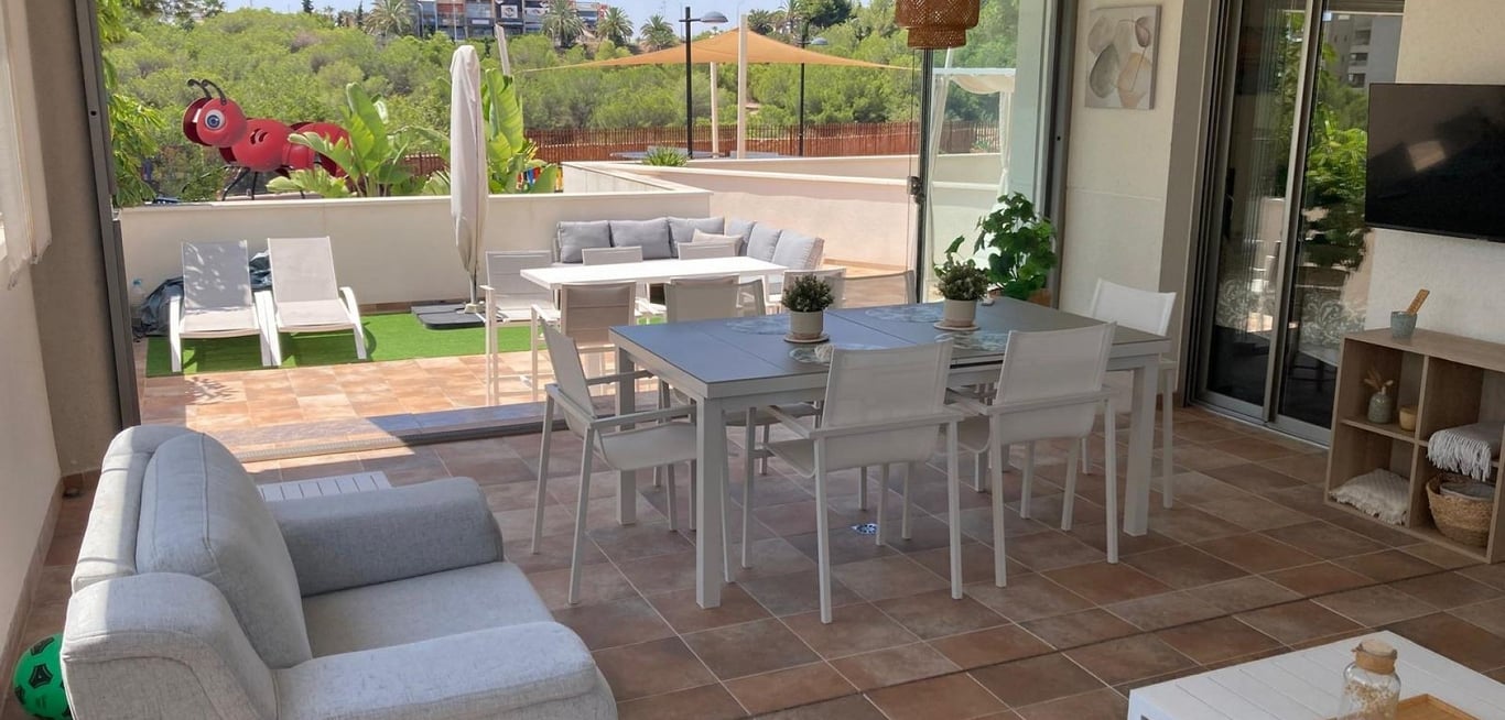 Exclusively for sale at AT HOME Real Estate! Ground Floor Apartment in Orihuela Costa – GREEN HILLS - LOS DOLSES This modern apartment (2020) with 2 bedrooms and 2 bathrooms is located in Los Dolses, an excellent location close to all amenities and leisure facilities. South facing! With a built area of 70 m2, the property features a fully equipped open-plan kitchen, a bright living room, two bedrooms and two bathrooms, and access to a huge 115 m2 private terrace (partially glazed so it c...