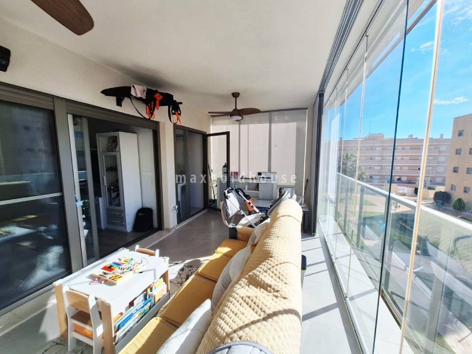 Beautiful high quality south facing apartment for sale in Los Dolses area, Villamartin, in walking distance to amenities like bars, restaurants, supermarkets, Zenia Boulevard and a golf course, and only 5 minutes drive to the white sandy beaches of Costa Blanca. The apartment comes with 2 bedrooms, 2 bathrooms (one ensuite), a very spacious open living / dining room with a good sized open kitchen, laundry room and a 25 sqm terrace with glass curtains. Furthermore there is an underground private ...