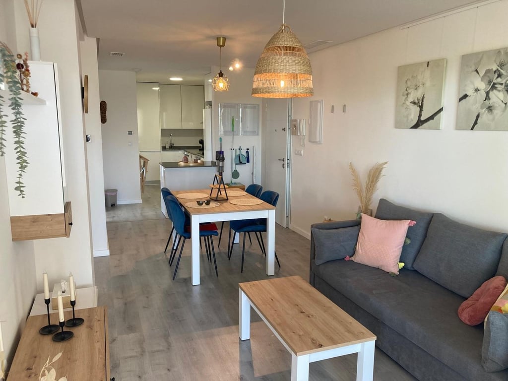 Exclusively for sale at AT HOME Real Estate! Ground Floor Apartment in Orihuela Costa – GREEN HILLS - LOS DOLSES This modern apartment (2020) with 2 bedrooms and 2 bathrooms is located in Los Dolses, an excellent location close to all amenities and leisure facilities. South facing! With a built area of 70 m2, the property features a fully equipped open-plan kitchen, a bright living room, two bedrooms and two bathrooms, and access to a huge 115 m2 private terrace (partially glazed so it c...