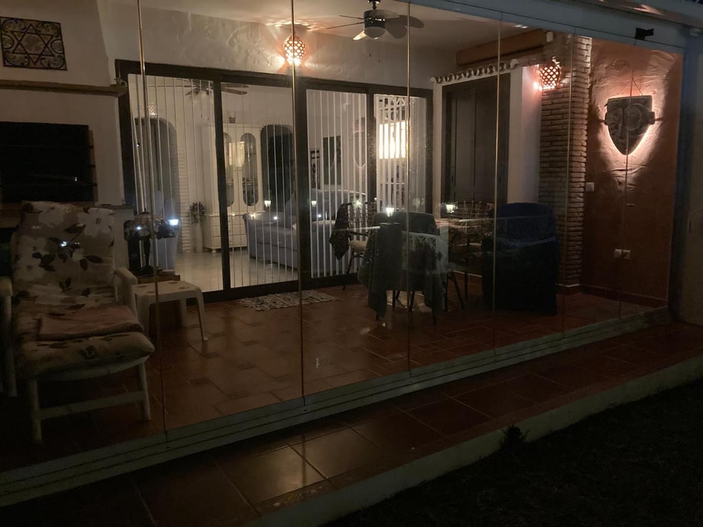 Ground floor garden apartment. Located on Calle Sirius in Riviera (lower part). It has two bedrooms with two bathrooms, a separate kitchen divided from the living room by a rustic archway and bar. Living/dining room with air conditioning and direct access to a covered terrace with glass curtains, from which you can access the garden and communal swimming pool. Ceramic floors, barbecue on the terrace. The complex consists of 16 properties in 3 blocks, where this apartment is located in a block wi...