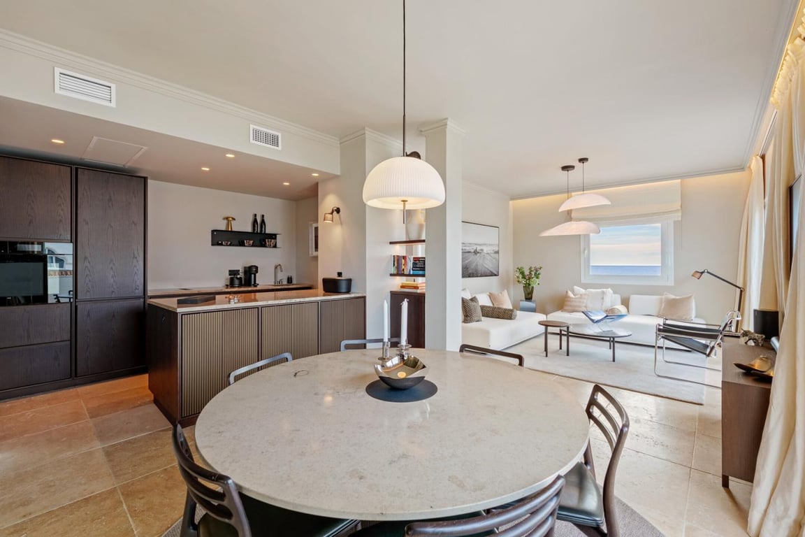 This beautifully renovated apartment is set within the prestigious frontline beach development of Andalucía del Mar, just steps from the promenade and the sandy beaches of Puerto Banús. Positioned slightly elevated within the gated community, the property enjoys open views over the lush tropical gardens and surrounding area, with partial sea views from its spacious terraces. The interior has been completely redesigned to a contemporary standard, featuring high-quality finishes and a refined, mo...