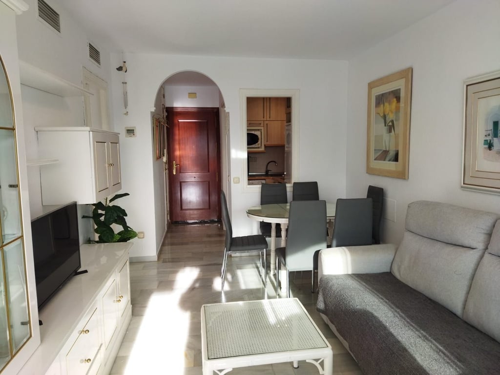 LA FONTANILLA!!!! APARTMENT WITH GARAGE, STORAGE ROOM, AND POOL!!! The best neighborhood located in the heart of Marbella. The apartment is on the sixth floor, facing southwest, which provides excellent natural light and includes hot/cold air conditioning. It comprises two bedrooms and a full bathroom with a shower and a window between the bedrooms, a living room with a separate, fully equipped kitchen, and a glazed terrace with glass curtains, allowing you to enjoy it year-round. It offers open...