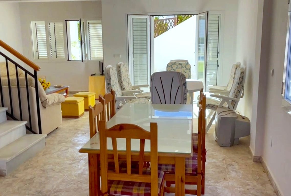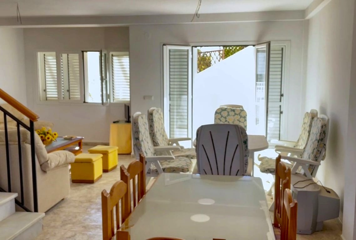 On the ground floor, you'll find a spacious lounge-dining room, a well-sized kitchen, and a toilet. The upper floor features three bedrooms, each offering partial sea views, with two bedrooms boasting private balconies. Additionally, there is a bathroom on this level. One of the standout features of this home is the expansive solarium, offering stunning views. The rear of the house includes a lovely 24 m2 patio off the lounge, overlooking the community pool and gardens. The front of the house ha...