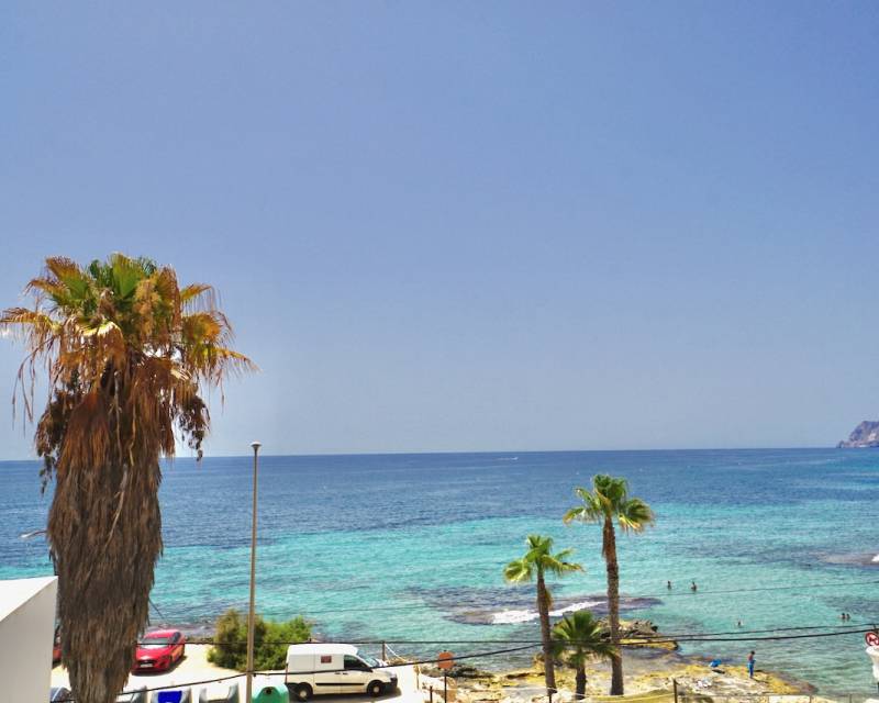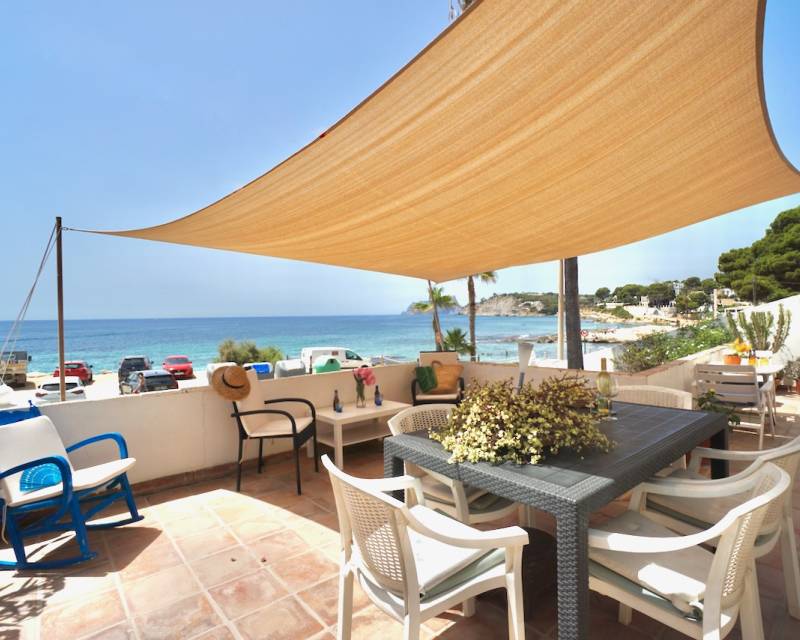 Frontline apartment for sale in Moraira South facing apartment with stunning sea views and in need of updating. This duplex apartment can be entered from street level or via the main level. The apartment comprises: spacious private terrace with impressive views, bright lounge-diner with terracotta floor, separate kitchen, smaller bedroom/office, bathroom and a double bedroom with a built-in wardrobe. On the lower floor: 2 bedrooms with access to the patio with a lot of potential, separate toil...