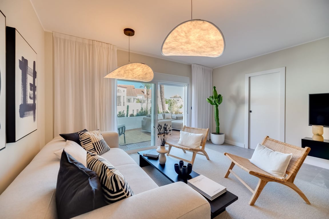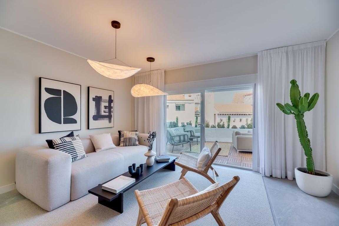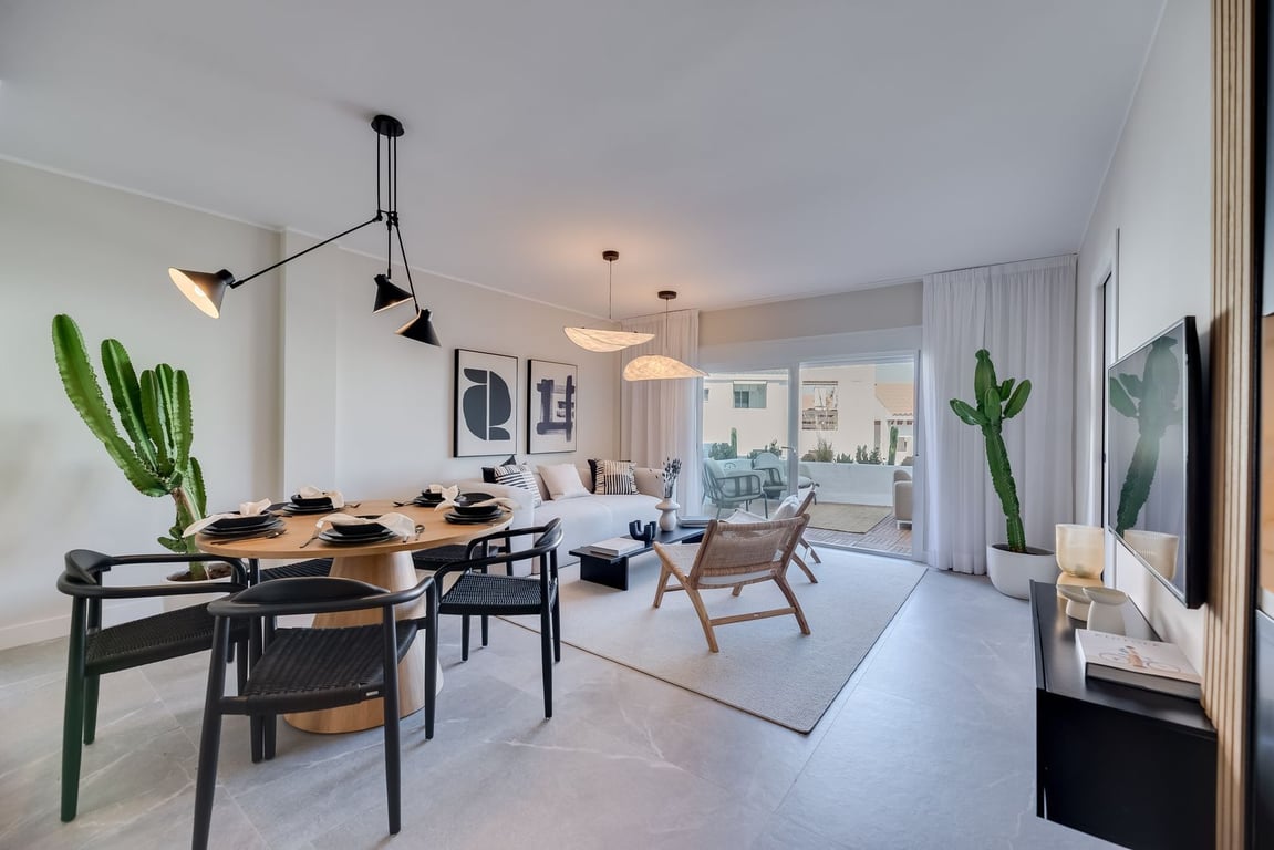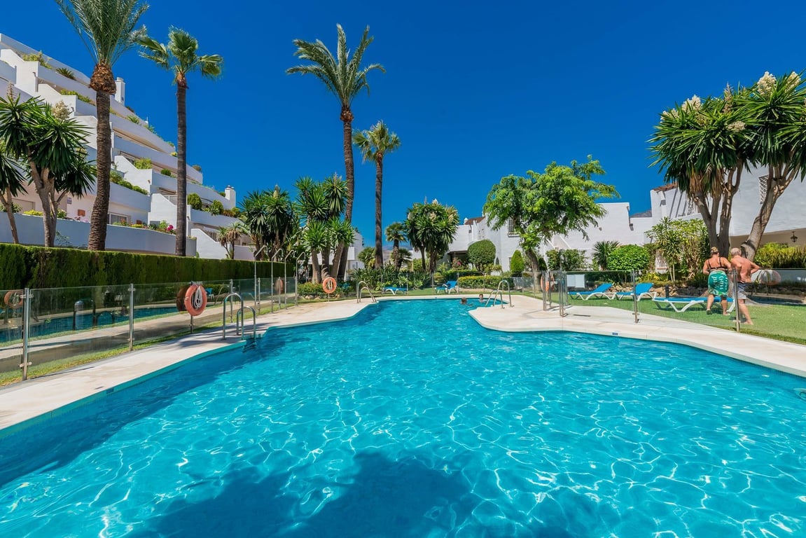 Urb. Jardines de Andalucia Newly renovated Scandinavian-inspired 4-bedroom and 2 bathrooms apartment with a spacious terrace and outdoor kitchen. The terrace is adorned with lush greenery, potted plants, and palm trees above, creating a natural and inviting ambiance. Walking distance to restaurants, bars, beach clubs and just few minutes drive to the best golf courses of Marbella, (Las Brisas Golf, Aloha Golf, Los Naranjos Golf) this apartment offers a balance between the perfect holiday home...