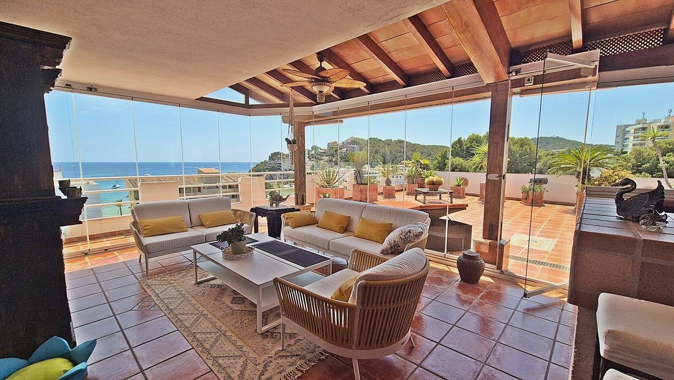This exceptional property includes a spacious penthouse with a spectacular terrace and an adjoining apartment – both with their own land registry but shared access. Perfect for guests, adult children, or as a home office. A: Penthouse – 123 sqm living space + 113 sqm terrace Penthouse above Paguera with stunning views over the beach to the sea – The spacious living-dining room with a semi-open kitchen flows seamlessly into the partially glazed panoramic terrace – with an outdoor barbecue and s...
