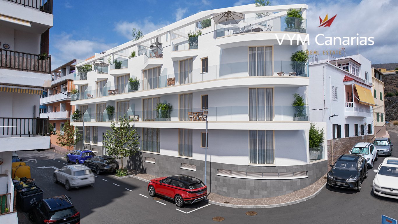 New build flats to be completed by the end of 2024 in the fantastic village of Puerto Santiago, just a few minutes from the beach and the Cliffs of Los Gigantes. The complex Santiago Deluxe offers 18 flats of different typologies, this one in particular is a first floor with two bedrooms, two bathrooms, open plan kitchen, very bright and with quality materials. It offers free storage room, included in the price, and the possibility of acquiring a parking space for 25.000 euros. Other types are a...