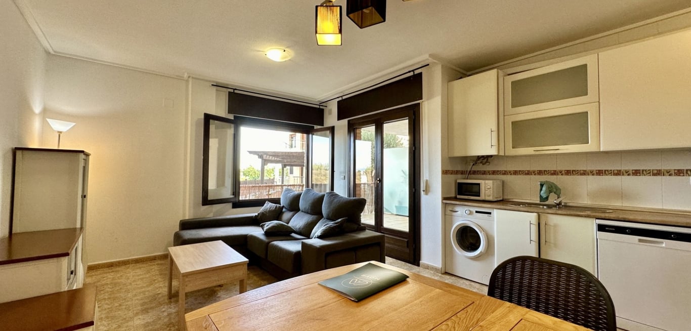 Spacious ground-floor apartment located just 1.1 km from the beach in the charming coastal town of Santiago de la Ribera.The property offers 3 bedrooms, 2 bathrooms, and includes a private garage space in the price. It features a bright living area with large windows facing the street, a modern kitchen, and access to a lovely communal garden and swimming pool. Built in 2009, the apartment is in excellent condition and ready to move into. Situated in a quiet residential area close to the 2 Ma...
