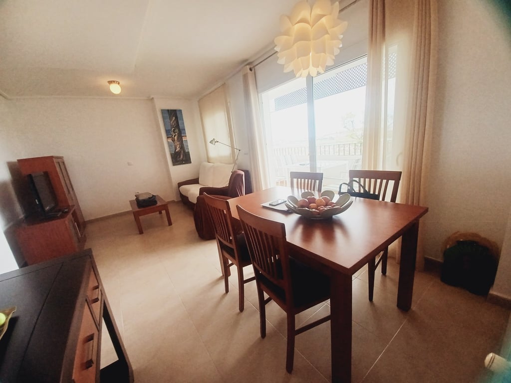 Situated close to the club house in Calle Atlantico, this first floor apartment on Hacienda Golf Resort offers spacious living, spectacular views and South facing terrace to enjoy sunshine all year round with glass curtains to open and close. The apartment enters into a spacious living room with curved wall feature, currently furnished with dining room table and chairs, sofa, storage units and TV. The kitchen is to the right and it is a very spacious kitchen with window views to the golf cours...