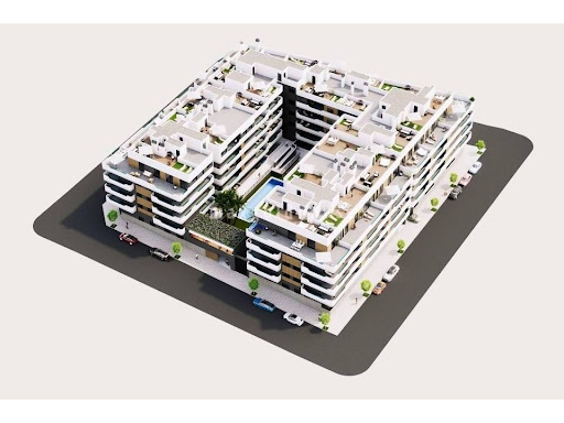 New apartments for sale in Santa Pola, close to the centre and only 1 km to the harbour. The blocks have 5 floors, the apartments come with 3 bedrooms, 2 bathrooms, open living / dining / kitchen area and terrace, and have pre-installation for airco. There are also 2-bedroom apartments available Ref. NEW-0461a). The top floors also have a solarium with inside stairs. The buildings have a lift. Underground parking space and storage need to be bought from 13 500 euros, depending on size of the gar...