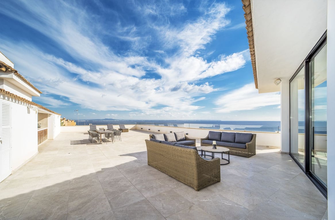 This luxurious open-floor-plan apartment in Ses Illetes offers breathtaking sea views, exceptional space, and modern amenities, making it a perfect coastal residence in Mallorca. Key Features Built Area: 350.95 m2 Interior Surface: 291.85 m2 Bedrooms: 4 Bathrooms: 4 Guest Toilet: 1 Private Roof Terrace: 281,30 m2 with panoramic sea views Private Garage: 38 m2 Open Floor Plan: Seamless flow between living, dining, and kitchen areas Air Conditioning and Heating Elevator/Lift Storage Sp...