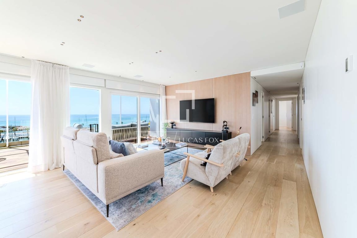 Step into this stunning penthouse and be immediately captivated by the expansive open-concept living space, where a breathtaking panoramic view of the port and sea unfolds. The entrance opens directly onto a spacious and light-filled living room and an elegant, fully equipped kitchen, seamlessly connected by a floor-to-ceiling glass wall that spans the entire width of the space. To the left, a modern designer kitchen with premium finishes invites culinary creativity, while the sun-drenched lou...