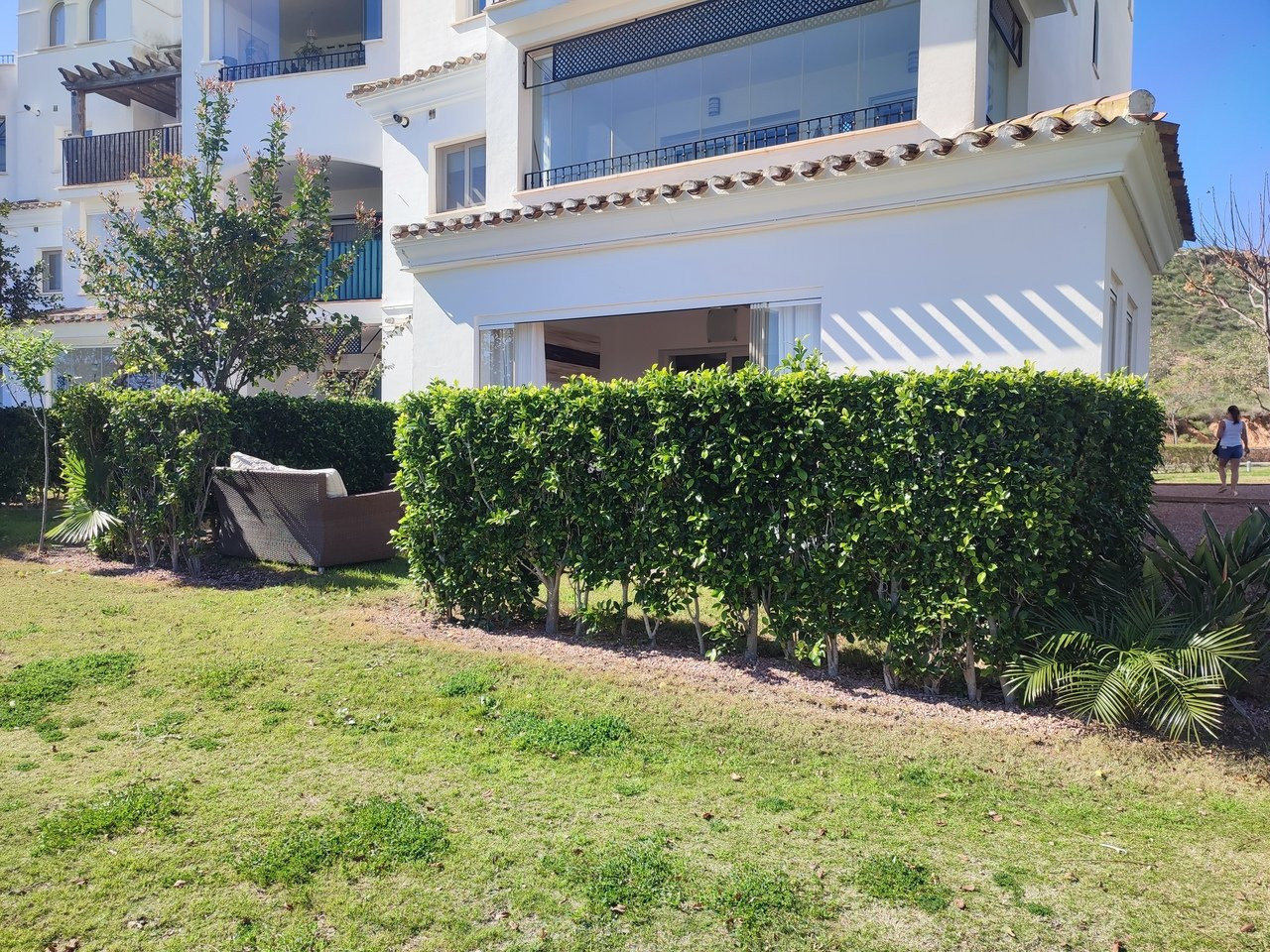 This sunny, well presented corner garden apartment offers one of the largest overall living spaces available on Hacienda Riquelme with the addition of the covered terrace with glass curtains that leads out to the private garden. Being a corned apartment this apartment is very light and airy with an extra window in the living room and also has a window in the good sized bathroom.This popular curved wall design apartment already has the largest kitchen of the apartments on the development and has ...