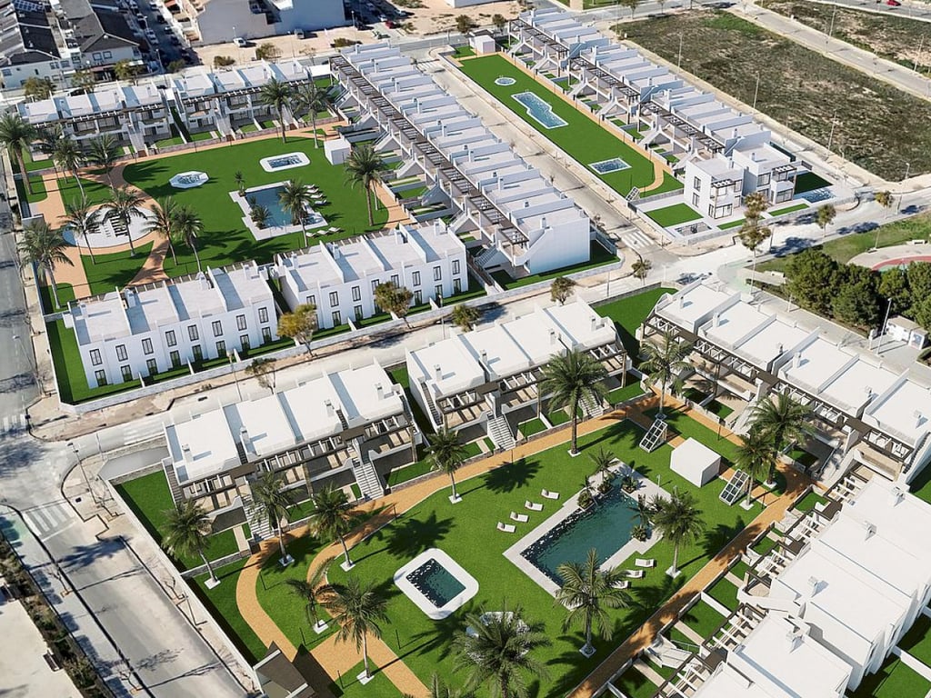 Thiar Village IV is a brand new development consisting of two bedrooms, with two bathroom luxurious maisonettes, located in the popular Pilar de la Horadada, which is a short walk from a host of amenities and the blue flag beaches. The ground floor properties offer two bedrooms with large gardens and the top floor maisonettes have two bedrooms, sunny balconies and large roof terraces with amazing views over the surrounding areas. All ground floor maisonettes have an open plan between livin...