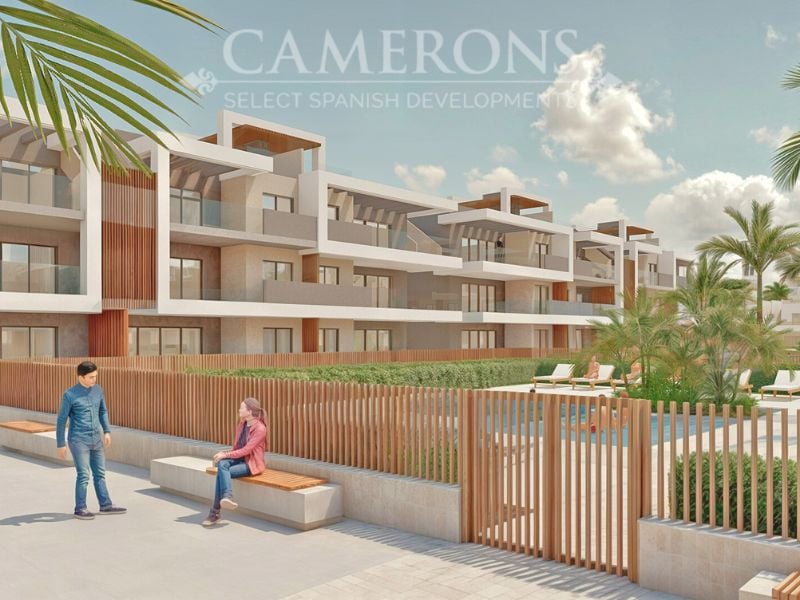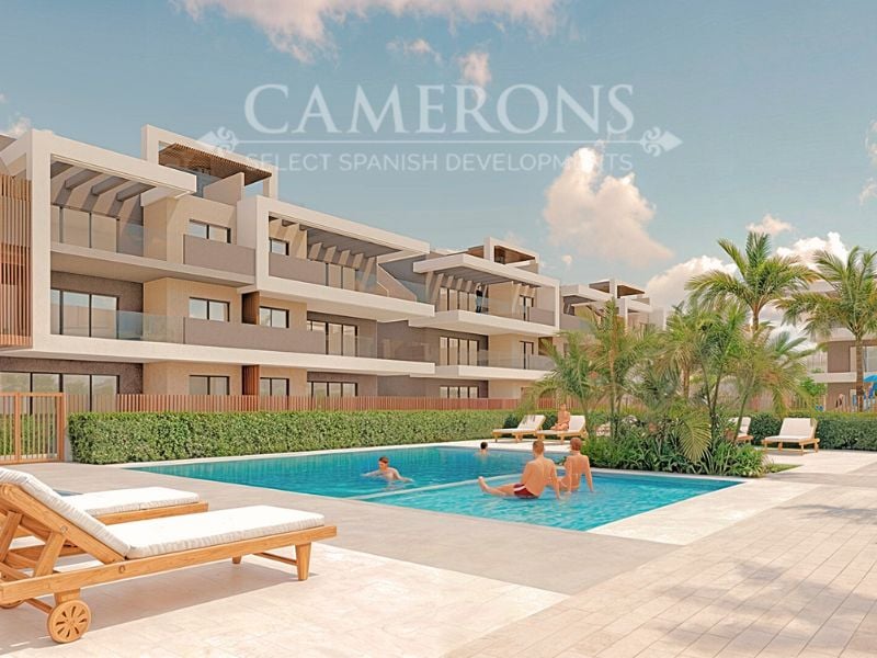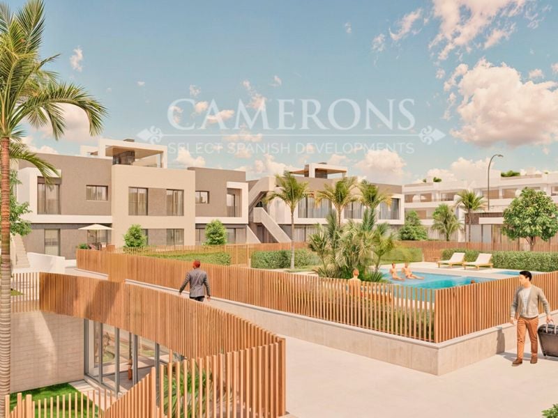 Fantastic new development of touristic apartments in the popular area of Torre de la Horadada, only 200m from the beautiful beach “Las Higuericas” and walking distance to bars, shops and restaurants. This amazing development of new build properties for sale, offer ground floor, and top floor apartments, all 3 bedrooms and 2 bathrooms with large terraces and outside space. The properties comes fully furnished with furniture, aircon, white goods lighting and store room. In the centre of the comple...