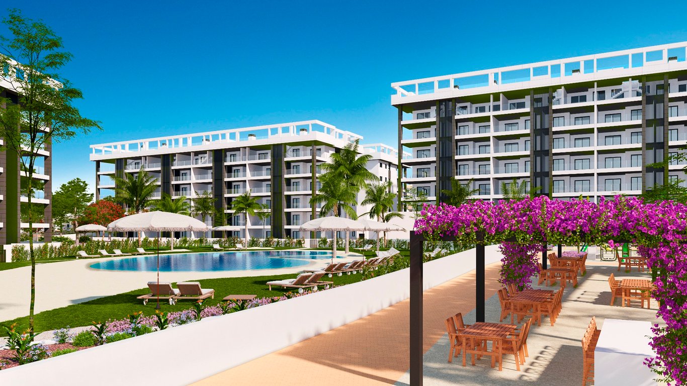 Apartments with 2 bedrooms, 2 bathrooms, penthouses with 3 bedrooms, 2 bathrooms and private solarium. The ground floor apartments have a private garden overlooking the resort gardens and pools. The penthouses have a large private solarium with access from the residence. The apartments have large southeast facing terraces that overlook the communal green areas with several pools. Each apartment has a parking space on the resort grounds.