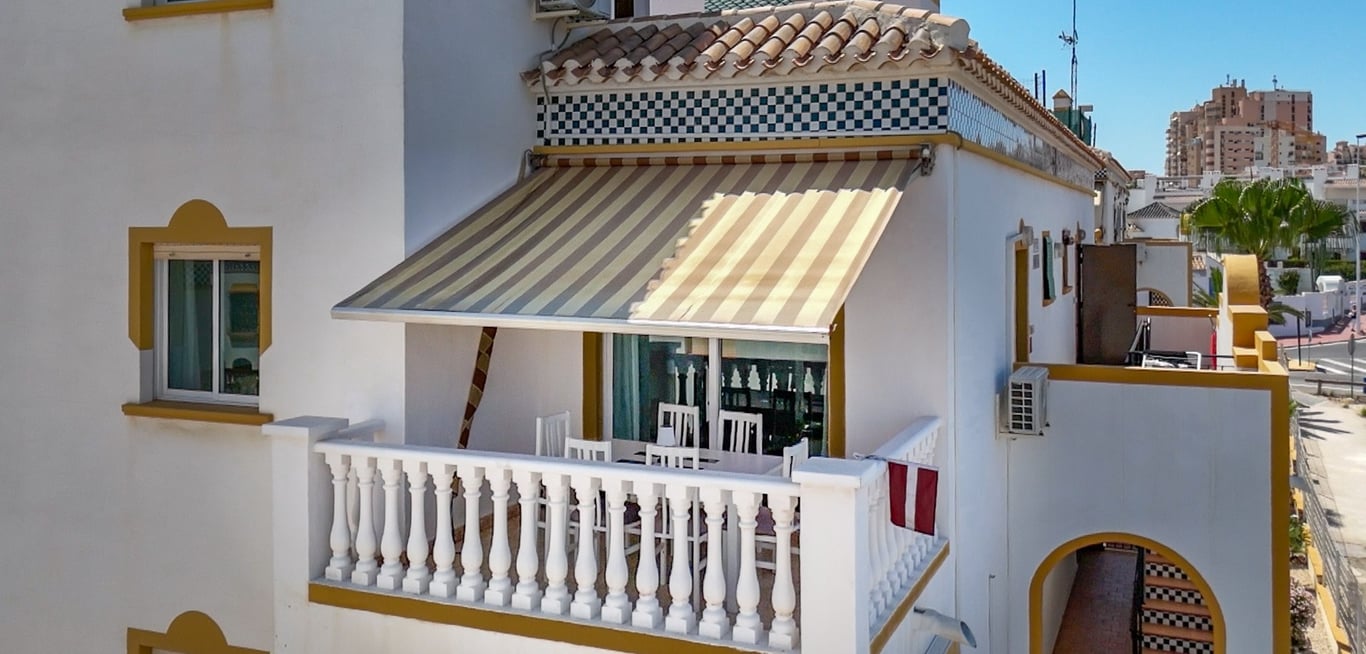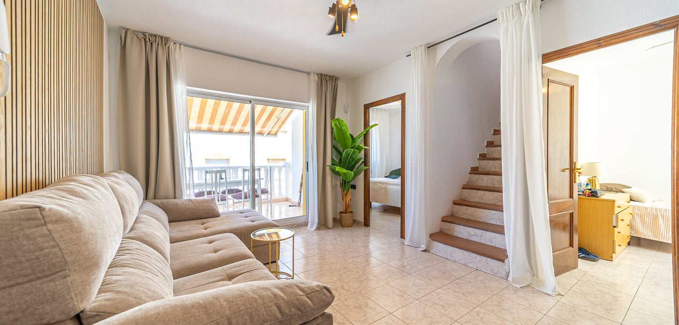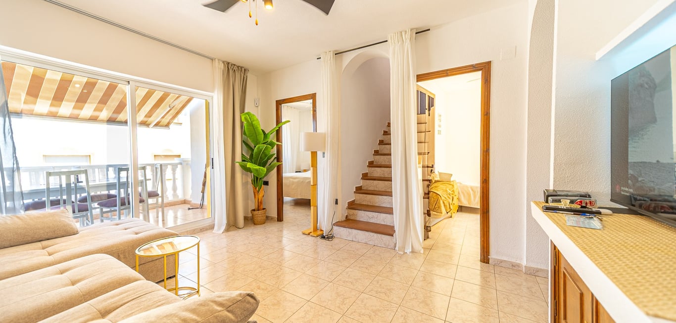 Duplex penthouse with large terrace and sunny solarium. Beautiful duplex penthouse located in a quiet residential complex with a communal pool. The property offers 3 bedrooms, 1 bathroom, a private kitchen, and a bright living room with access to a private terrace. The upper floor features an additional bedroom and a spacious sunny solarium with barbecue and panoramic city views. The apartment has new air conditioning, is sold furnished, and is ready to move in. Key features: 3 bedro...