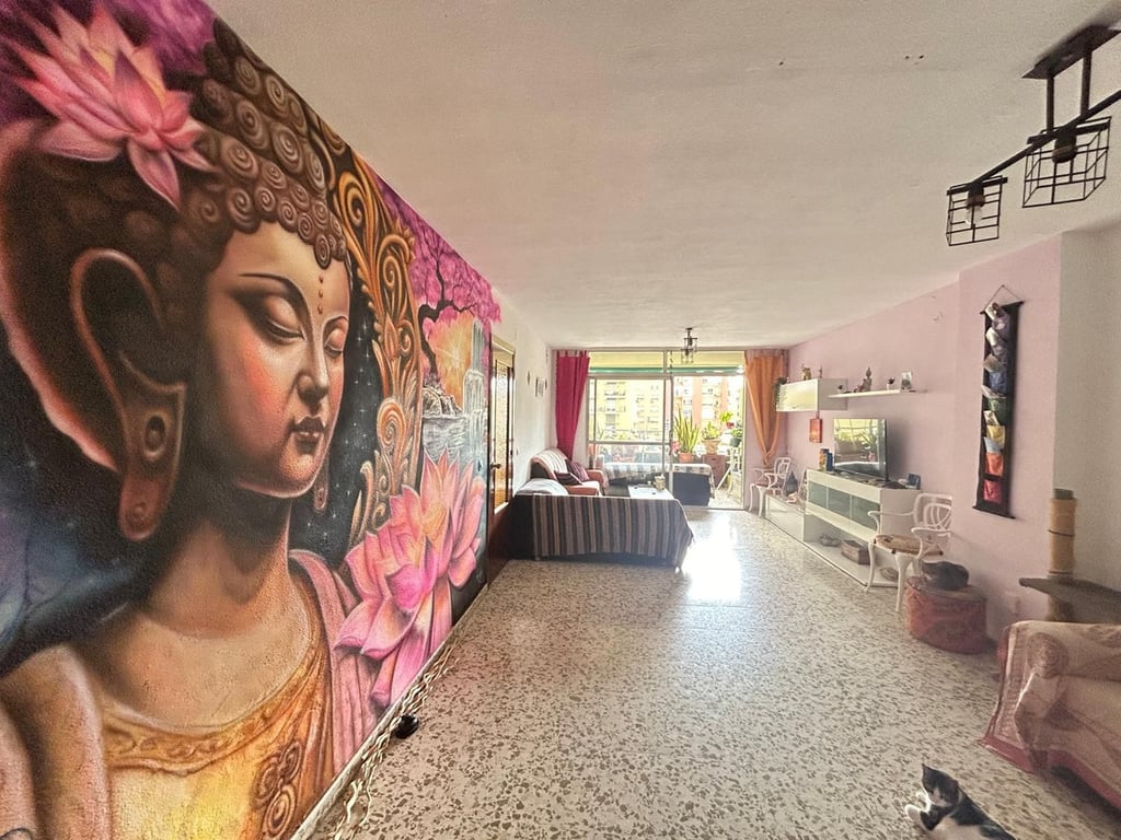 This flat in Torremolinos offers a spectacular location! Just 1 minute from the centre, south facing to enjoy the sun, a large terrace of approximately 10 square metres and four bedrooms along with two full bathrooms. It also has a separate kitchen with utility room and a large entrance hall, as well as a spacious living and dining room. Furthermore, a parking space is included in the same building. Although in need of refurbishment, this flat has great potential to be a beautiful home in a pr...