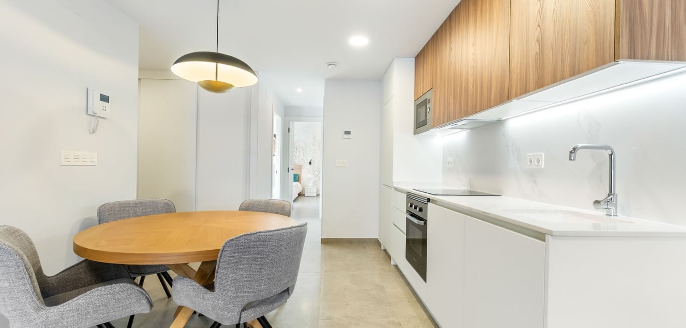 Modern resale apartment offers a functional and bright layout in a convenient area of Torrevieja. It consists of two bedrooms, including the main one, and two bathrooms equipped with glass shower screens and wall-mounted sinks; one finished with textured white tiles and the other with a wood-effect design. The bedrooms have a simple, minimalist style, with windows that provide good natural light. One bedroom includes a decorative wall as part of the interior finish. The open-plan living ar...