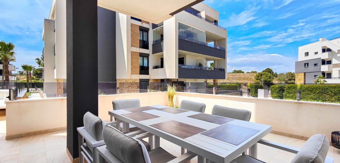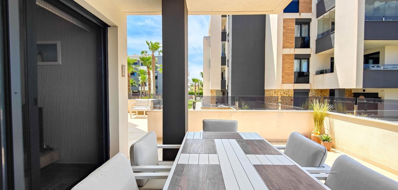 Stunning ground floor corner apartment for sale in a Res. Amanecer / Sunrise VI - Orihuela Costa. Discover this stylish and modern apartment located on the ground floor of a prestigious residential complex in Los Altos, La Florida. The property enjoys an south west facing corner terrace with direct views over the beautifully landscaped communal gardens and the swimming pool. This bright and spacious apartment features 2 bedrooms and 2 bathrooms, a contemporary open-plan living area, and a fully ...