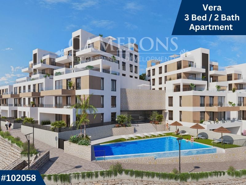 This apartment development offers 2 and 3 bedroom options, both with 2 bathrooms.Next to the town of Vera, rich in culture and close to the beach, there are two 18-hole golf courses in the immediate surroundings. Desert Springs golf course is located less than 10km from the complex and Aguilon Golf course is just a short drive away.Both Murcia and Almeria airport are both about an hour away.Click here for 2 bed option