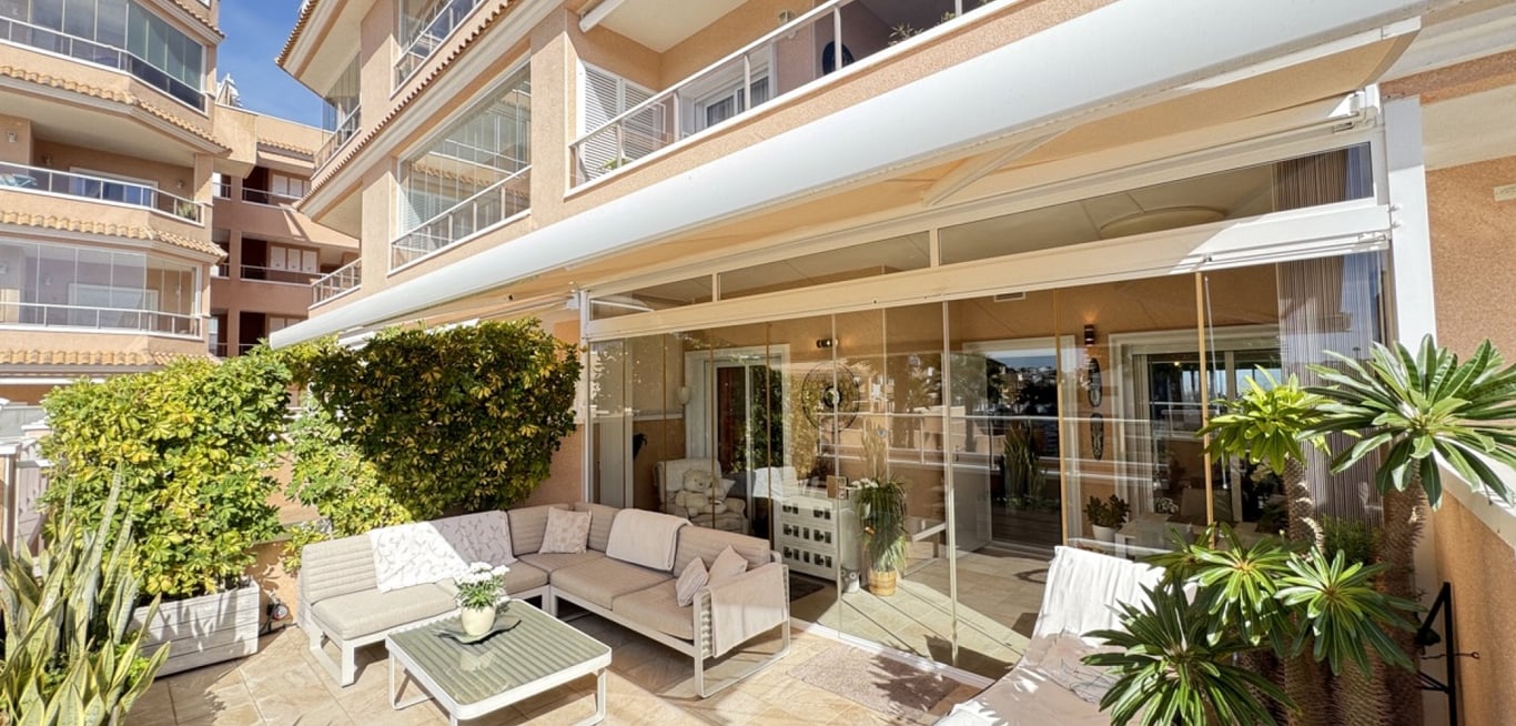 Experience the ultimate in comfort and luxury in this fabulous 2-bedroom, 2-bathroom ground floor modern apartment, perfectly situated in the desirable Vista Azul XXIX complex in Villamartin. KEY FEATURES: - South-Facing Front Terrace: Relax and unwind on the lovely south-facing front terrace with seating area, perfect for alfresco dining or relaxation. - Enclosed Terrace with Ducted Air Conditioning: Enjoy the enclosed terrace with dining area, equipped with ducted air conditioning, ma...