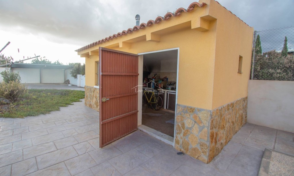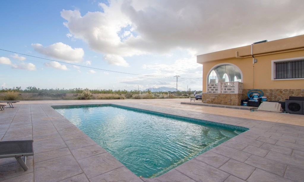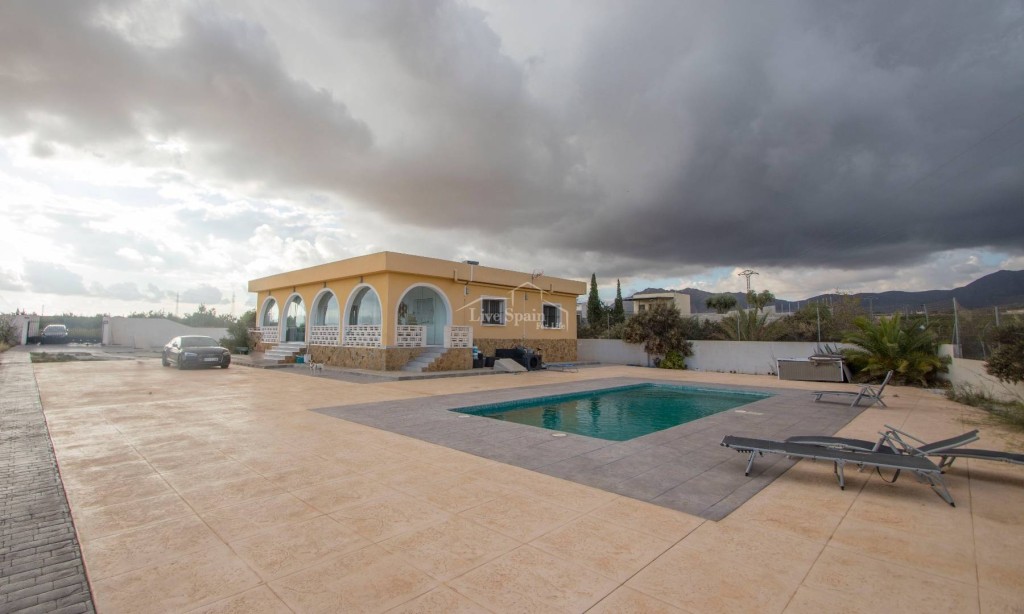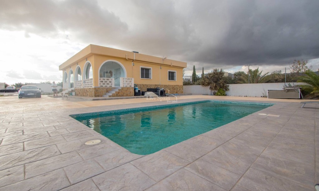 DETACHED VILLA, 3 BEDROOMS, 2 BATHROOMS, PRIVATE POOL, LARGE PLOT, ALBATERA A lovely 3 bedroom country property of 140m2 in a quiet area of the campo of Albatera but also a short distance into town with beautiful views and mountain backdrop. This property is located on a plot of aprox 5000 m2. Consisting of the house, terraces, shower, outside kitchen/barbecue, pool and carport. You enter the property directly from the covered terrace with glass curtains into the spacious living room with ...