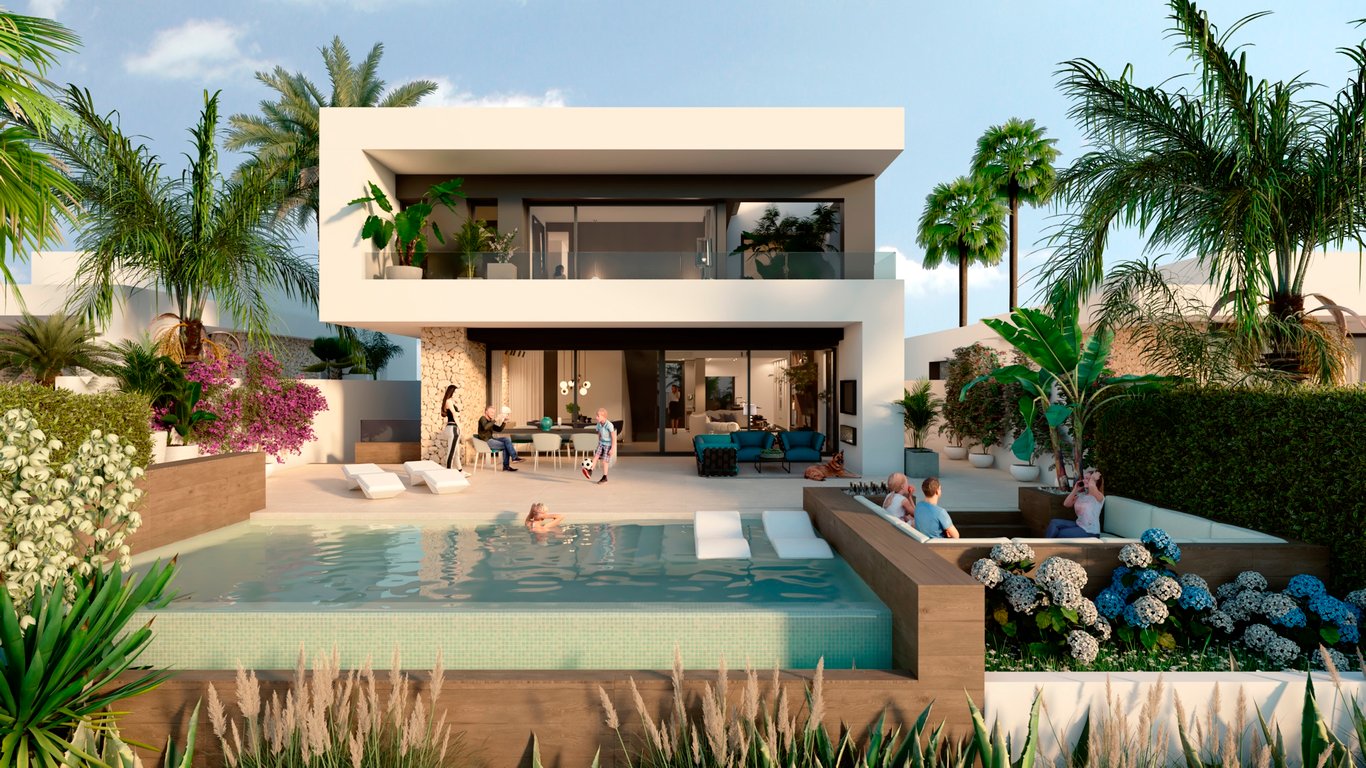 Luxurious modern detached villa located on the first line of the golf course "La Finca Golf", on the Costa Blanca South. The area of the villa has its own commercial area with a wide range of restaurants, bars and shops. The residential also has a fantastic 5* hotel with SPA and a beautiful clubhouse with sports facilities. The neighboring towns of Algorfa, Ciudad Quesada and Benijófar offer services including an international school. The beautiful sandy beaches of Guardamar are only a 10 minute...