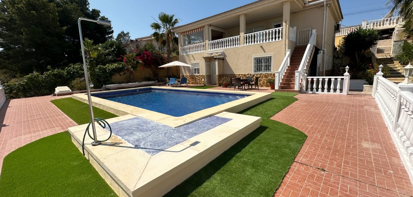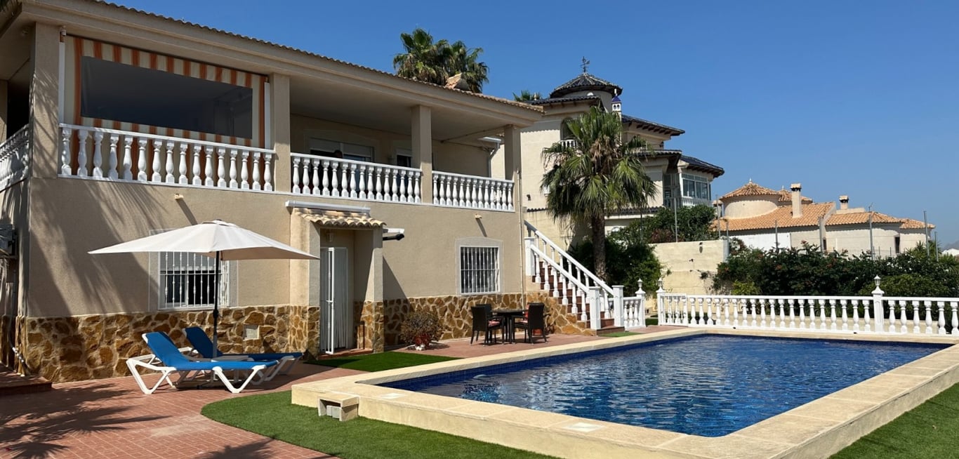 We bring you this magnificent detached Villa in the prime area of Lomas de Juliana in Algorfa , across from the 5 star Finca golf resort and in a convinient location 2km to Algorfa village, 5 min to ciudad Quesada and 25 min to Alicante airport. The property was built by the current owners and designed for comfort living; split in 2 levels , on the top floor you have the living area with kitchen , utility area,guest toilet and superb wrap around terrace with amazing views to the mountains, s...