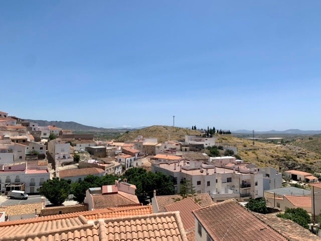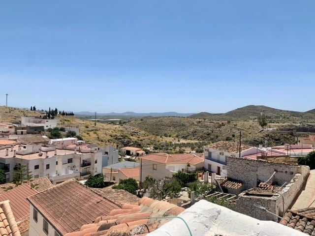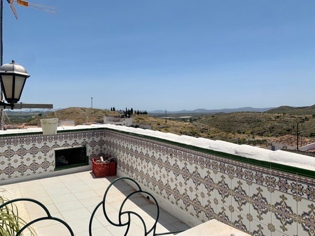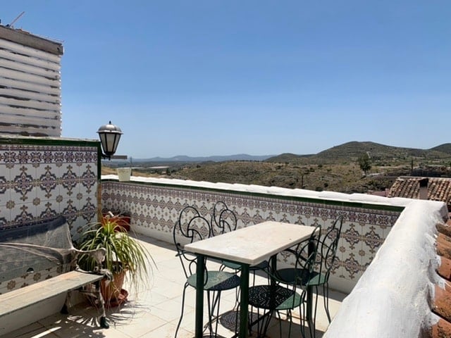 A large corner townhouse with 4 DB bedrooms, 1 bathroom with a garage and a roof terrace offering panoramic views of this pretty village. Enter the property into the hallway and immediately left is a DB bedroom with A/C, right is the sitting room with a DB bedroom off. Take the marble stairs up to the kitchen and a pretty roof terrace fully tiled in typical Andaluz tiles. A breath-taking view of the village and distance mountains and the monastery. On the lower level a further two DB bedroo...