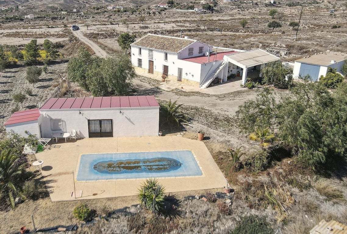 The property includes multiple buildings and a separate guesthouse. The main farmhouse spans 263 m2 over two storeys and is in excellent condition. The ground floor features a spacious lounge with an open fireplace, a large kitchen/diner also with an open fireplace, a pantry, three bedrooms, and one bathroom. Upstairs, there is another large lounge, three bedrooms, and one bathroom. The house boasts a charming covered porch area and a roof terrace. Attached to the rear are 189 m2 of outbuildings...